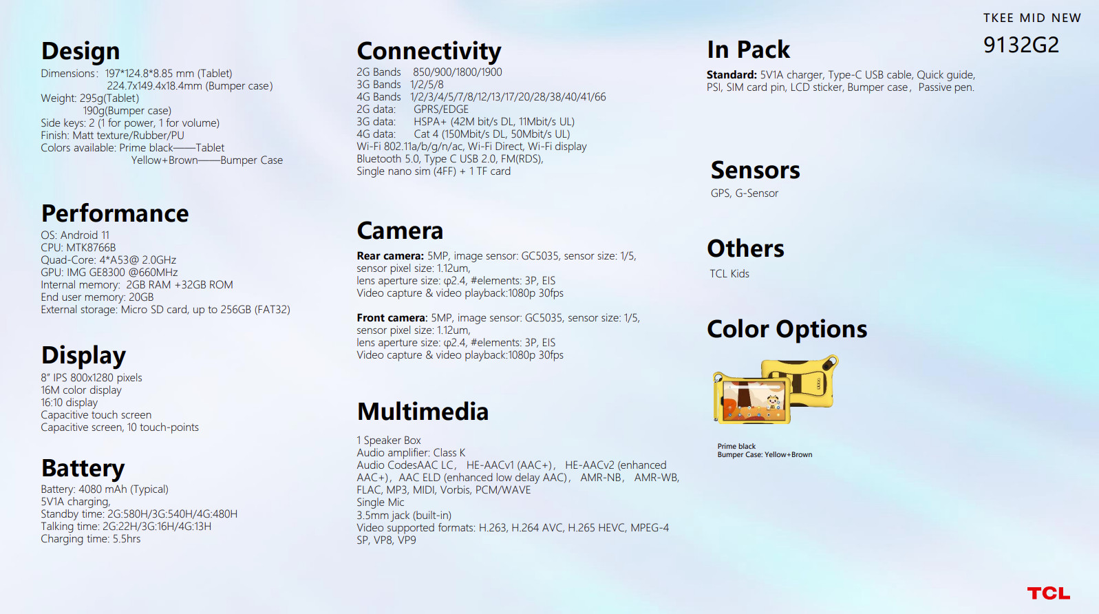 Das bisherige Produktportfolio von TCL bei den preiswerten Android-Tablets erhält ebenfalls einen Refresh in den jeweiligen Displayformaten. Das TCL Tab 10L ist ein 426 Gramm schweres und 9,2 Millimeter flaches Android-11-Tablet mit MediaTek MTK8167B und 2/32 GB Speicher, 10,1-Zoll-Display (1.280 x 800 Pixel) und 4.080-mAh-Akku, das Tab 8 4G (G2) wiegt 295 Gramm und arbeitet mit einem MT8766B von MediaTek und hat ebenfalls 2/32 GB an Bord. Als Besonderheit bietet das Tab 8 4G (G2) integriertes 4G LTE. Die neuen Versionen des Tkee Mid (8 Zoll, HD) und Tkee Max (10 Zoll, HD) adressieren mit speziellen gelbfarbenen Bumper-Cases wieder Kinder als Zielgruppe.