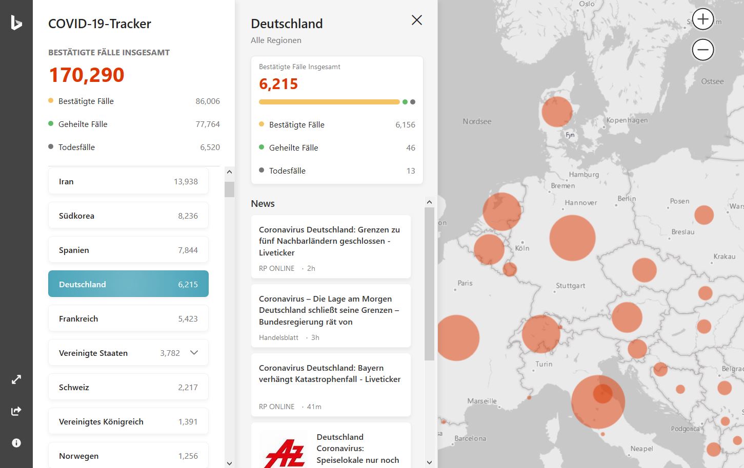Während das Coronavirus weltweit immer mehr Menschen infiziert und Produktionsketten unterbricht, entwickeln einige Tech-Unternehmen spezielle Angebote für das Virus. Und so hat auch Microsoft in seiner eigenen Suschmaschine namens Bing eine spezielle Karte veröffentlicht, auf der man die Ausbreitung des Virus verfolgen kann. Je nachdem, welches Land man hier auswählt, erhält man dann noch zusätzliche Informationen, wie die genaue Anzahl der Infizierten, wie viele schon geheilt sind und die Anzahl der Toten.