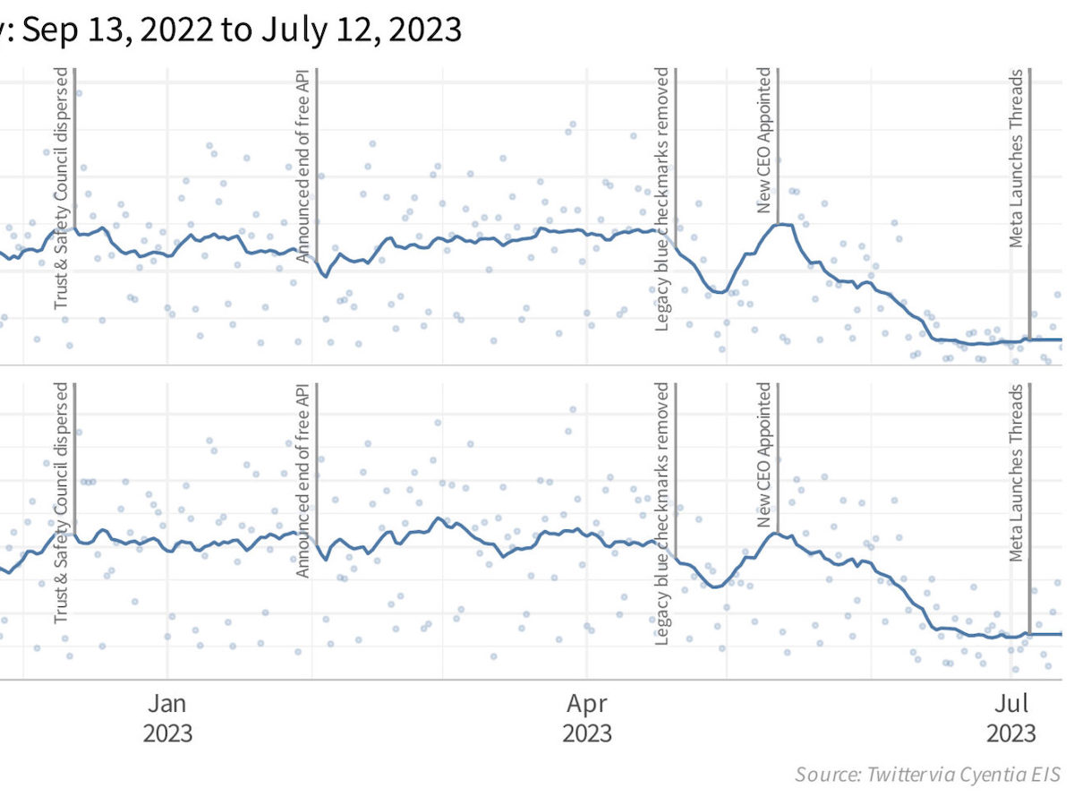 Doch das war nicht von Dauer. Kurz darauf erholte sich die Infosec-Community wieder. Erst mit der Benennung von Linda Yaccarino als neue Chefin von Twitter sanken die Zahlen nachhaltig. Gab es zu Hochzeiten noch um die 1.300 täglichen Tweets, sank diese Zahl in den letzten Monaten auf nur noch etwas über 300 Tweets pro Tag herab. Die letzten Daten hat Jacobs am 12. Juli erfasst.