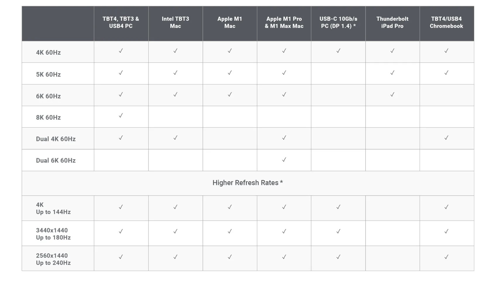 Wie die Tabelle oben zeigt hängt die Display-Kompatibilität davon ab, an welches Gerät das CalDigit TS4 angeschlossen wird. Die größtmögliche Flexibilität bietet der Anschluss an ein Apple MacBook Pro (ca. 2.100 Euro auf Amazon) mit Apple M1 Pro oder M1 Max, damit wird neben 8K-Bildschirmen sogar der simultane Betrieb von zwei 6K-Monitoren mit 60 Hz unterstützt.