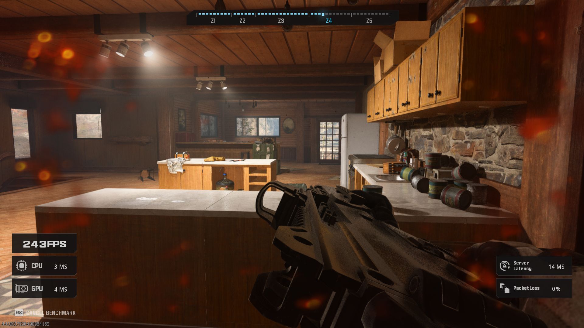 Großes Lob verdienen die Entwickler auch für den integrierten Benchmark, wenngleich sich dieser nicht im Grafikmenü befindet, sondern völlig unpassend bei „Private Match“ versteckt ist. Die Geschwindigkeitsmessung zeigt zuerst eine Kamerafahrt im Nebel und dann fast eine Minute lang den Lauf eines Charakters in Ego-Perspektive durch Außen- und Innenareale mit sehr viel Action und Effekten (Rauch, Explosionen etc.), wodurch die Grafikkarte ordentlich gefordert wird.