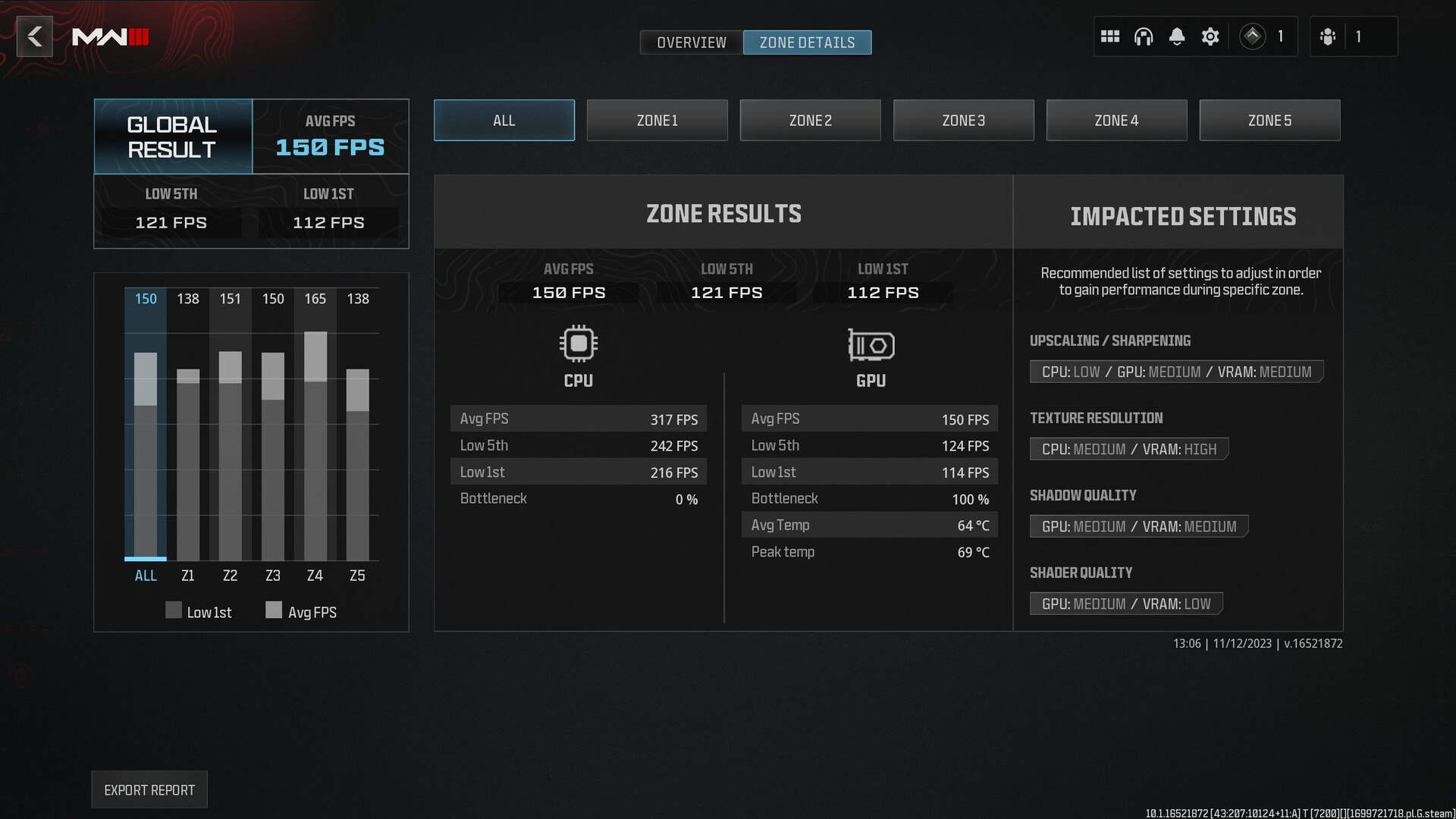 Top: Während der Messung werden die FPS präsentiert. Am Ende des Benchmarks erscheint eine besonders umfangreiche Auswertung inklusive System-Specs, CPU- bzw. GPU-FPS und (V)RAM-Auslastung. Im zweiten Reiter wird die Performance sogar nach verschiedenen Zonen aufgesplittet. Derart detaillierte Infos sind uns zuletzt nur bei der PC-Version von Returnal untergekommen.