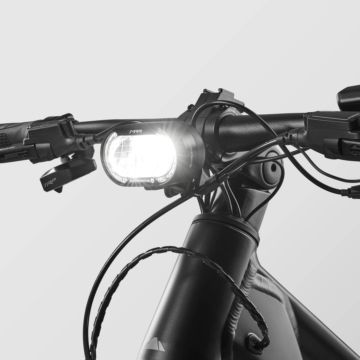 Vorhanden ist eine Tektro RD-8000E 12s-Kettenschaltung. Diese kann auf Wunsch automatisch agieren, womit etwa bei Steigungen der richtige Gang eingelegt wird, zudem könnte eine solche Funktion auch beim häufigen Anfahren beispielsweise im Stadtverkehr sinnvoll sein. Verbaut ist ein Bosch Performance Line CX-Motor der fünften Generation, welcher von einem Bosch PowerTube-Akku mit einer Kapazität von 800 Wh gespeist wird, ein Range Extender mit 250 Wh kann noch genutzt werden. Genutzt werden 27,5 Zoll große Maxxis Crossmark II Reflexstrip Clincher-Reifen.