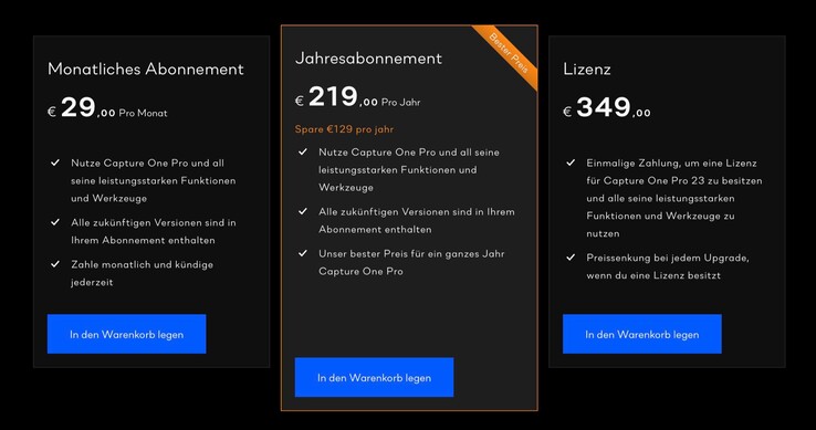 Wer Capture One nutzen möchte, hat aktuell zwei Optionen. Die Software wird entweder als Abonnement für 219 Euro pro Jahr bei Vorauszahlung für das ganze Jahr, bzw. 29 Euro pro Monat bei monatlicher Zahlung angeboten, oder aber als Lizenz für einen Einmalkauf für 349 Euro. Wer sich für diese Lizenz entscheidet, erhält Updates, bis die nächste, große Version von Capture One erscheint, die mit Rabatt erworben werden kann – derzeit liegt der Upgrade-Preis bei 209 Euro.