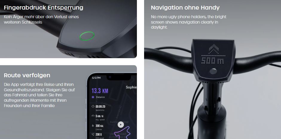 Es handelt sich um ein smartes E-Bike. So ist ein GPS-Modul vorhanden und die Mobilfunkanbindung ist dank eines LTE-Modems ebenfalls möglich - damit lässt sich ein gestohlenes Fahrrad wiederfinden. Die Entsperrung ist mithilfe des Fingerabdrucksensors möglich, das verbaute Display unterstützt die Navigation. Erhältlich ist das E-Bike ab sofort zu einem Preis von knapp 3.000 Euro.
