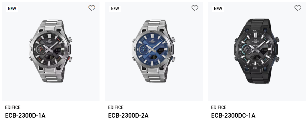 Drei Edifice Sospensione ECB-2300-Modelle – ECB-2300D-1A, ECB-2300D-2A und ECB-2300DC-1A – wurden von Casio auf der internationalen Website gelistet, was auf eine bevorstehende Markteinführung außerhalb Japans hinweist. Spezielle Produktseiten für die Edelstahlvarianten (D-1A, D-2A) und die Black-Ion-Version (DC-1A) sind nun weltweit verfügbar.