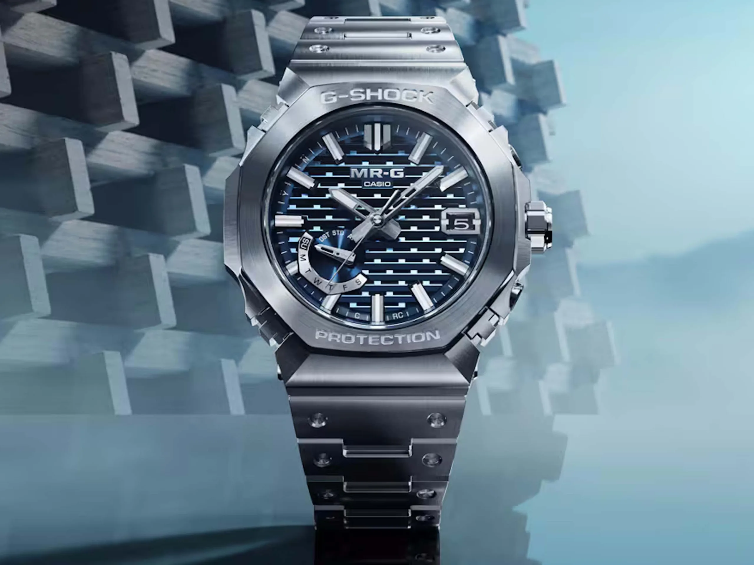 Das Design der MRGB2100D-2A in Blau und Silber ist laut Casio von der ältesten Pagode der japanischen Region Tohoku inspiriert. Das indigoblaue Zifferblatt besticht durch ein geometrisches Muster sowie silberne Akzente und ist durch Saphirglas geschützt. Eingefasst wird es von einer silberfarbenen Lünette aus Cobarion und einem Gehäuse mit Titancarbid-Finish (TiC). Passend dazu ist die Uhr mit einem Titanarmband ausgestattet.