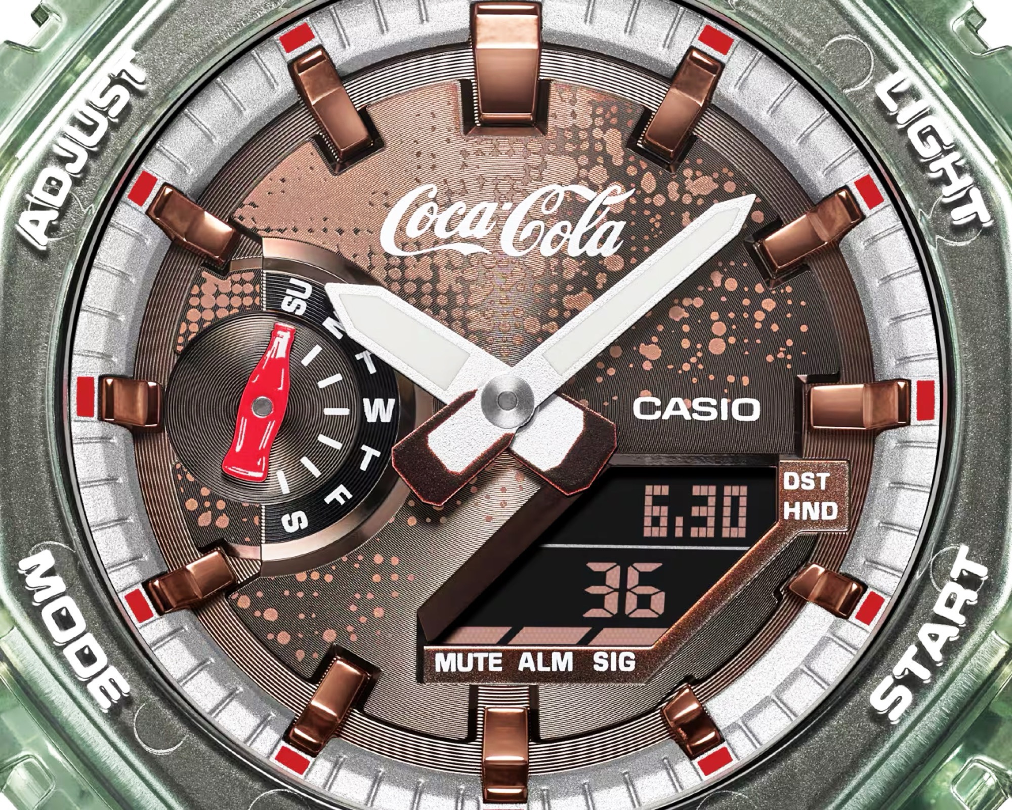 Das braune Zifferblatt ist dagegen eine Anspielung an die Farbe des Kultgetränks, die helleren Stellen symbolisieren die Kohlensäure. Die Komplikation, welche den aktuellen Wochentag anzeigt, nutzt eine kleine Coca-Cola-Flasche als Zeiger. Die Rückseite wird mit dem Bild eines Kronkorken einer Coca-Cola-Flasche verziert. Technisch entspricht die Uhr der regulären G-Shock GA-2100, die Limited Edition ist also bis 200 Meter wasserdicht und kann daher auch zum Schwimmen getragen werden.