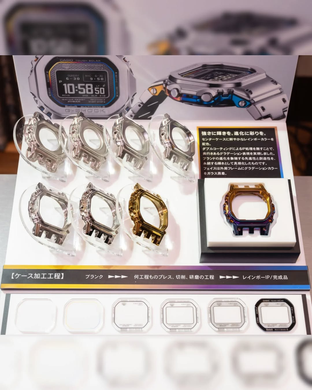 Eine der schärferen Aufnahmen zeigt zudem den mehrschichtigen Aufbau des Gehäuses. Mehrere unfertige Metallschalen sind neben einer fertig beschichteten, regenbogenfarbenen Einheit zu sehen und verdeutlichen den mehrstufigen Bearbeitungs- und Veredelungsprozess. Das Seitenprofil offenbart ein weiteres Detail, das zuvor weniger deutlich war: Lünette, Gehäuse und Innenstruktur wirken stärker segmentiert als bei älteren GMW-B5000-Modellen. Die Übergänge zwischen den polierten Stahloberflächen und dem farbigen Innenrahmen sind klar erkennbar, ebenso wie leichte Farbunterschiede bei Schrauben und Drückern.