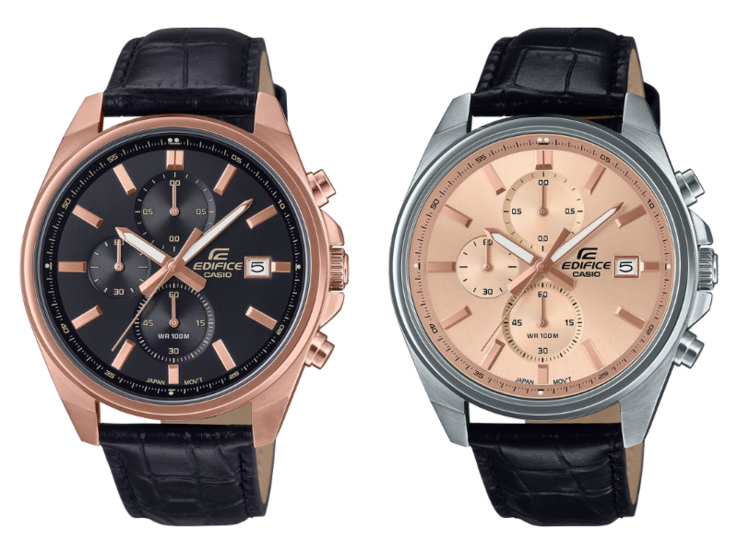 Die EFV-610ECL-1A kombiniert ein schwarzes Zifferblatt mit einem roségoldfarbenen Edelstahlgehäuse und einem schwarzen Lederarmband. Die EFV-610EL-5A bietet ein roségoldenes Zifferblatt, ein klassisches Edelstahlgehäuse und ebenfalls ein schwarzes Lederarmband. Beide Modelle besitzen eine schmale Lünette und werden von Casio als „mittelgroß“ beschrieben – mit Gehäusemaßen von 48,6 x 43,8 x 11 mm (~1,9 x 1,7 x 0,4 Zoll).