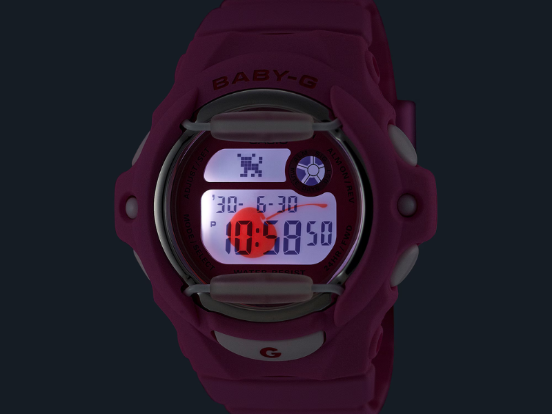 Beide Modelle BG-169 enthalten zahlreiche Anspielungen auf Kirschen, wie beispielsweise kirschrote Akzente und ein rotes Kirschmotiv, das erscheint, sobald die LED-Hintergrundbeleuchtung eingeschaltet wird. Die Zeit wird auf den Uhren sowohl im 12-Stunden- als auch im 24-Stunden-Format angezeigt, zusammen mit dem gegenwärtigen Datum und dem Wochentag. Zu den zusätzlichen Funktionen, die dieses Gerät bietet, zählen fünf Alarme, die täglich eingestellt werden können, ein Countdown-Timer mit einer maximalen Dauer von 24 Stunden und eine Stoppuhr, die in 1/100-Sekunden-Schritten misst. Darüber hinaus bietet die Telememo-Funktion die Möglichkeit, bis zu 25 Telefonnummern zusammen mit den dazugehörigen Kontaktnamen zu speichern. Die Modelle verfügen über eine Wasserfestigkeit von bis zu 200 Metern und weisen eine geschätzte Batterielaufzeit von ungefähr drei Jahren auf.