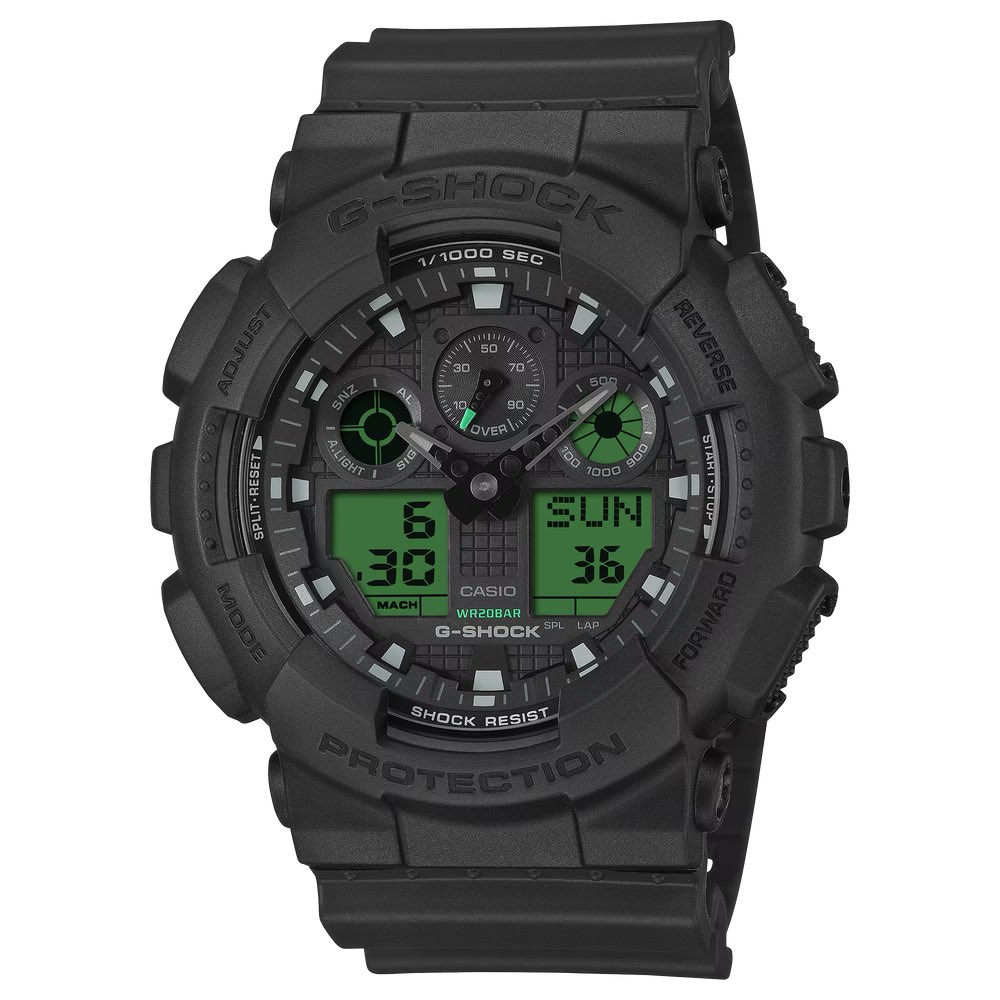 Als Nächstes folgt die GA-100BEG-1A (18.700 Yen, etwa 102 Euro). Dieses robuste Digital-Analog-Modell verfügt über Casios klassisches Triple-Graph-Layout mit zwei elektrogrünen LCD-Feldern im unteren Bereich, die einen markanten Kontrast zum eleganten schwarzen Gehäuse bilden. Es zeichnet sich durch grün gefärbte Zeiger und Hilfszifferblätter aus und verbindet eine mechanisch anmutende Ästhetik mit hoher antimagnetischer Widerstandsfähigkeit gemäß JIS-Klasse 1 sowie einer Batterielaufzeit von bis zu zwei Jahren.