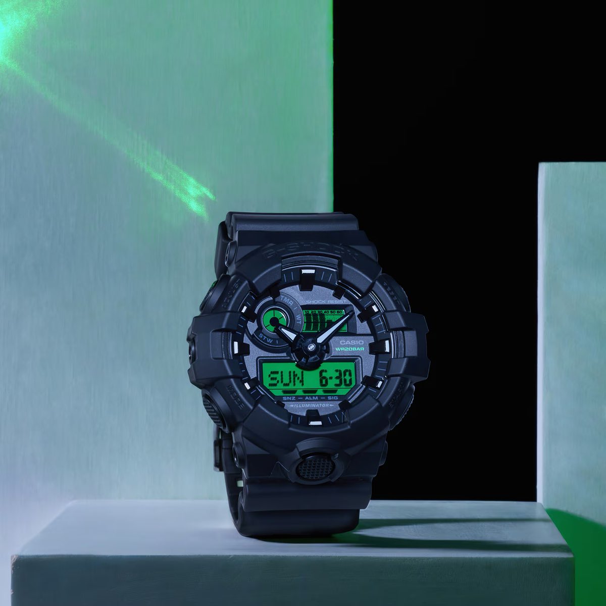 Die GA-700BEG-1A besticht durch ein deutlich markanteres Design mit robusten Kunststoffrahmen und einem auffälligen, strukturierten Frontlichtknopf. Anstelle eines zweigeteilten Displays verfügt sie über ein einzelnes, klares elektrogrünes LC-Display, große 3D-Zeiger und ein rundes Hilfszifferblatt. Sie verzichtet auf eine antimagnetische Abschirmung, bietet jedoch eine Batterielaufzeit von bis zu fünf Jahren. Der Preis liegt bei 18.700 Yen (etwa 102 Euro) und entspricht damit dem der GA-100BEG.