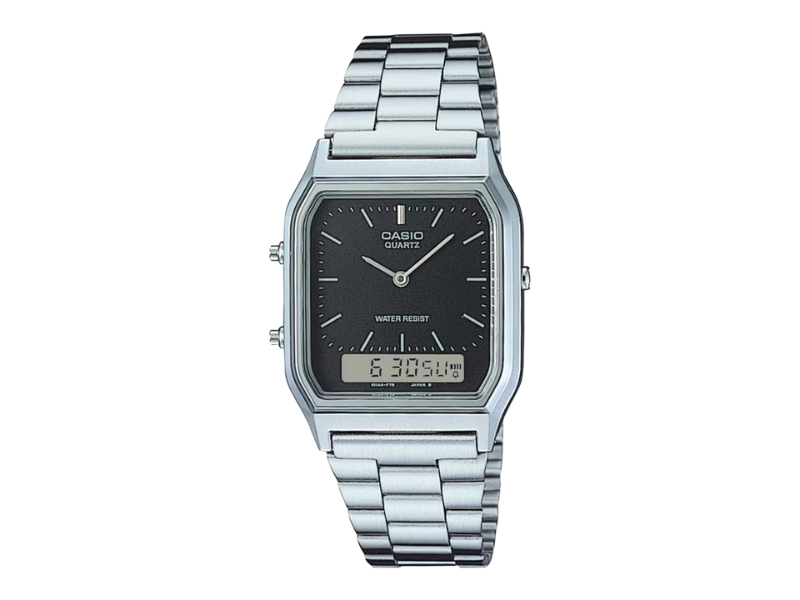 Die AQ230A-1DM kombiniert ein klassisches analog-digitales Layout mit einem schwarzen Zifferblatt, zwei analogen Zeigern für Stunden und Minuten sowie einem schlanken, hellen Digitaldisplay auf 6 Uhr. Das verchromte Gehäuse mit Harzlünette misst 38,8 × 29,8 × 8,1 Millimeter und wiegt 47 Gramm. Ein Armband aus Edelstahl, das über einen Verschluss verfügt, der individuell angepasst werden kann, vervollständigt das Design im Retrostil.
