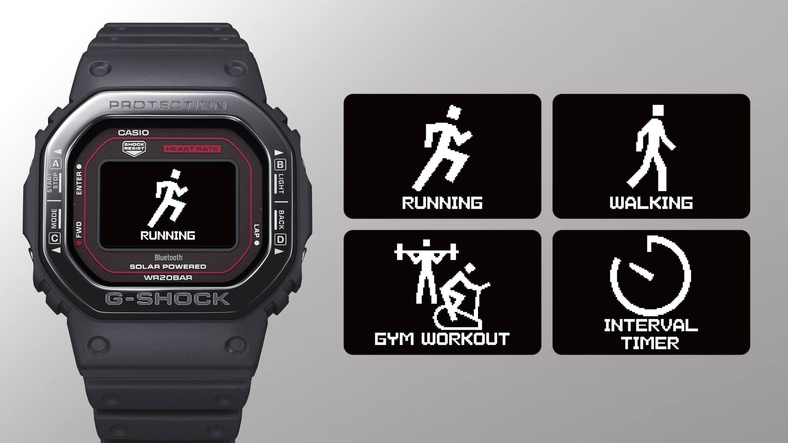 Die Multisportuhren der 5600er Serie wurden von Casio entwickelt, um beim Tracking der eigenen Trainingseinheiten zu helfen. Sie verfügen über einen optischen Sensor zur Überwachung der Herzfrequenz und des Sauerstoffgehalts im Blut sowie über einen Sensor zur Schrittzählung. Für Trainingsanalysen und Atemübungen können die beiden neuen G-Shock Move Uhren auf die Polar Smartwatch-Bibliothek zugreifen. Zudem sind die Uhren mit der beliebten Lauf-, Rad- und Wander-App Strava kompatibel. Beide 5600-Modelle verfügen über ein MIP (Memory-in-Pixel) LCD-Display sowie Bluetooth-Konnektivität, die weitere Funktionen wie die Schlafanalyse über die Casio Watches App ermöglicht. Die neuen G-Shock-Uhren mit den Typenbezeichnungen DWH5600MB1A4 und DWH5600MB8A9 haben eine Laufzeit von rund 35 Stunden mit einer Akkuladung, die durch Solaraufladung noch verlängert werden kann.