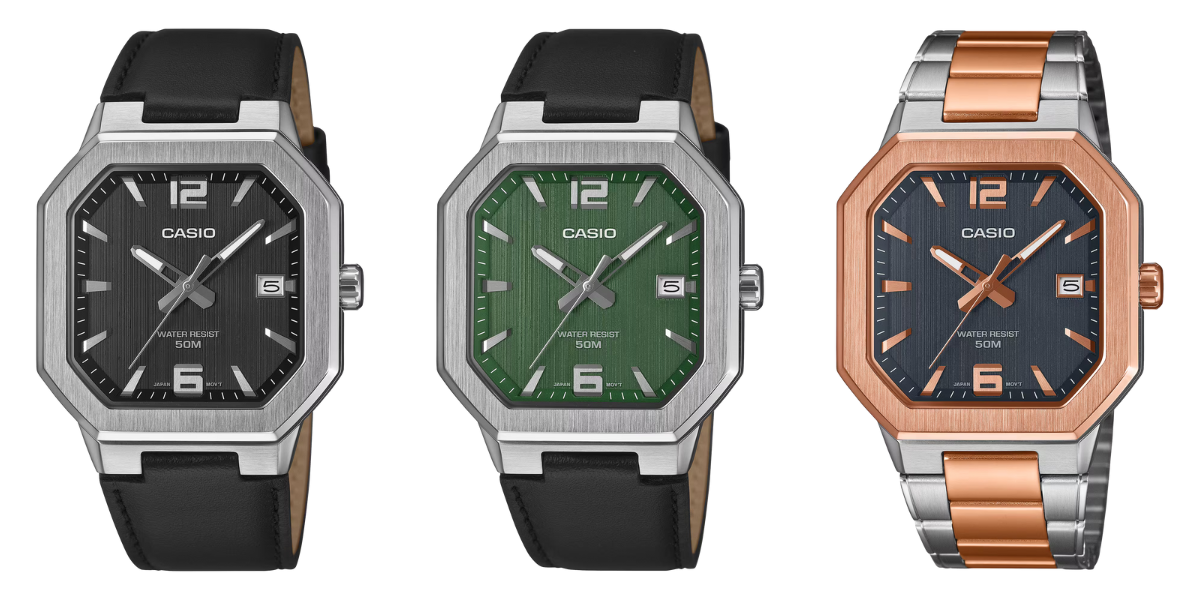 Casio hat ein neues Standard-Uhrenmodell vorgestellt: das Modell MTP-B195. Sieben Versionen dieser Analoguhr sind bereits in den Produktlisten der internationalen Markenwebsite aufgetaucht, was auf einen baldigen Start in verschiedenen Märkten hindeutet. Die Casio MTP-B195 wird als Uhr mit "eleganter, kantiger Linienführung" beschrieben und verfügt über ein achteckiges Gehäuse mit texturierter Oberfläche.