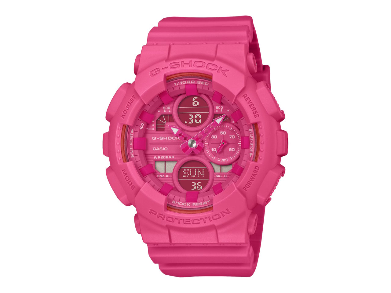 Dieses Pink-Ribbon-Modell ähnelt der regulären, pinkfarbenen G-Shock GMAS140PP-4A, welche hier auf Amazon erhältlich ist. Es unterscheidet sich jedoch durch seine invertierten LCD-Displays. Zudem stimmen die Farben der Logos und der Minutenmarkierungen mit denen des ikonischen Pink-Ribbon-Logos überein. Eine erhöhte Lünette verbessert die Stoßfestigkeit der bis zu 200 Meter wasserdichten Uhr.