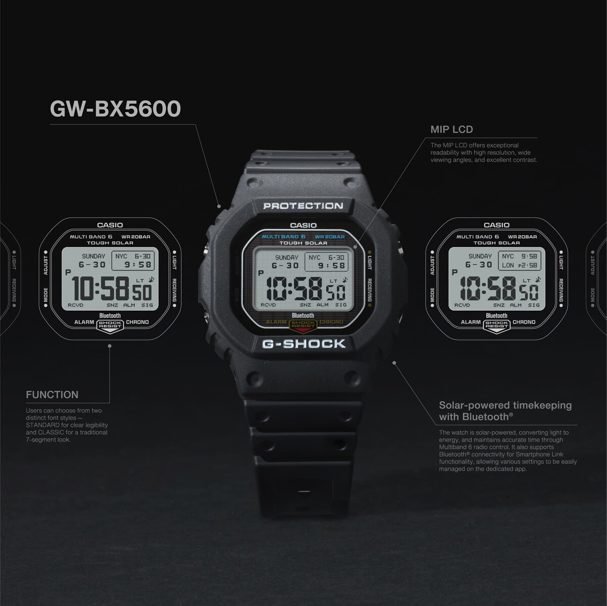 Sowohl die GW-BX5600-1JF als auch die GW-BX5600-1A1JF können ab sofort vorbestellt werden und werden voraussichtlich noch im November ausgeliefert. Beide Modelle verfügen über Casios neuestes, hochauflösendes MIP-LCD (Memory-in-Pixel-LCD), das eine bessere Klarheit als das Standard-Display der DW-5600 bietet. Die GW-BX5600-1JF nutzt das charakteristische G-Shock-Ziegelstein-Motiv mit einem hellen Akzentring, während die GW-BX5600-1A1JF ein dezenteres „Blackout“-Design aufweist.