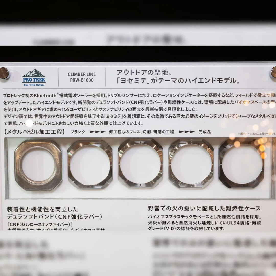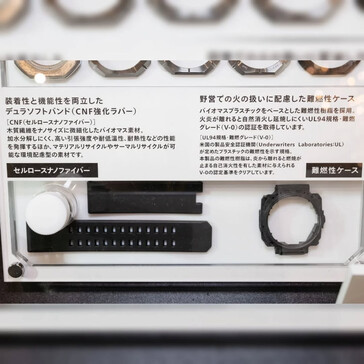 Darüber hinaus enthüllt die Präsentation, dass Casio für das Armband Zellulose-Nanofaser (CNF)-verstärkten Gummi verwendet. Dies ermöglicht eine höhere Verschleißfestigkeit und die Integration von umweltfreundlichem Biokunststoff. Spezielle Display-Hinweise heben die Flammbeständigkeits-Zertifizierung von Armband und Gehäuse, die durch die Verwendung von Materialien der Güteklasse UL94 V-0 erreicht wurde, hervor. Dies ist ein wichtiges Merkmal für einen sicheren Einsatz im Gelände.