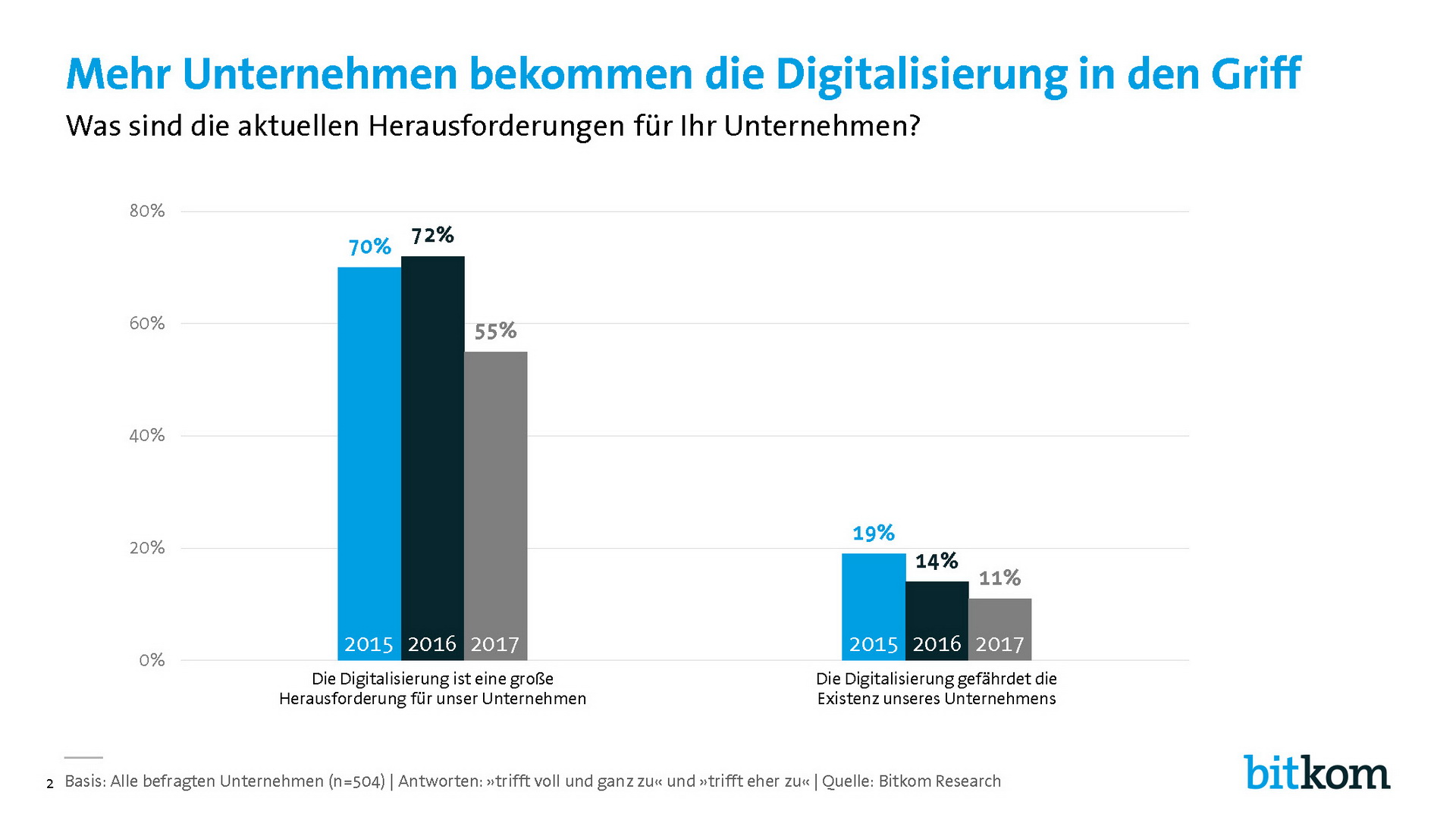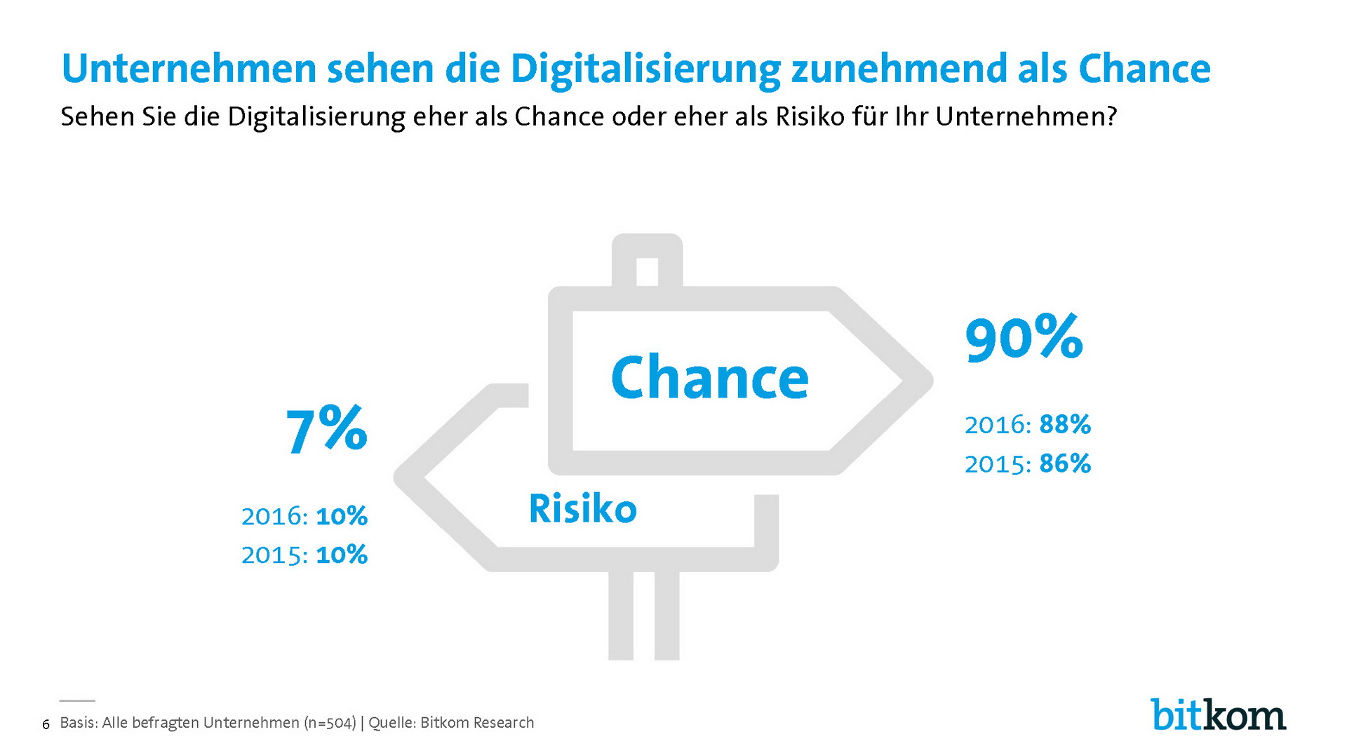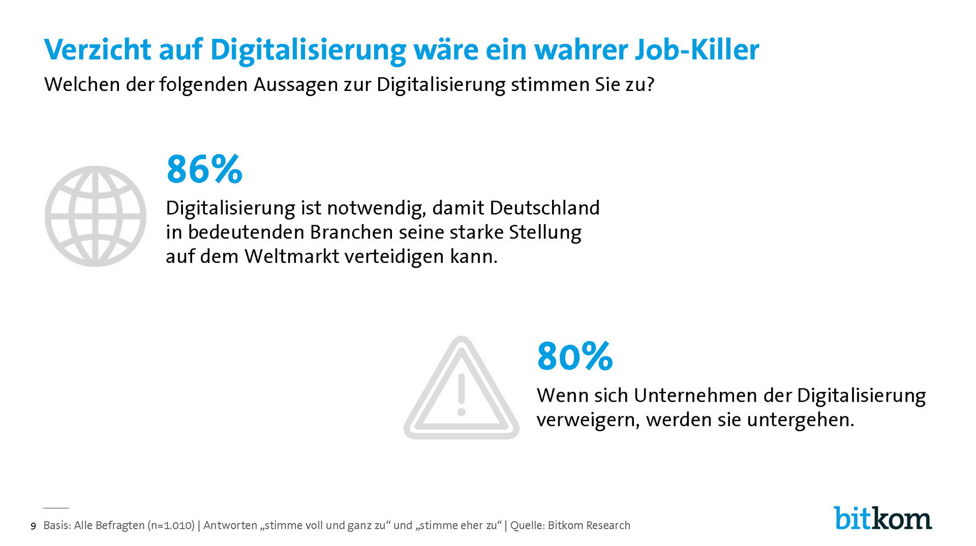 Das ist das Ergebnis einer repräsentativen Umfrage im Auftrag des Digitalverbands Bitkom, die auf der CeBIT 2017 in Hannover vorgestellt wurde. Laut der Befragung ist für 86 Prozent die Digitalisierung notwendig, damit Deutschland in bedeutenden Branchen wie dem Maschinen- oder dem Automobilbau seine starke Stellung auf dem Weltmarkt verteidigen könne. 80 Prozent sind der Meinung, wenn sich Unternehmen der Digitalisierung verweigerten, würden sie sich ins Aus manövrieren.