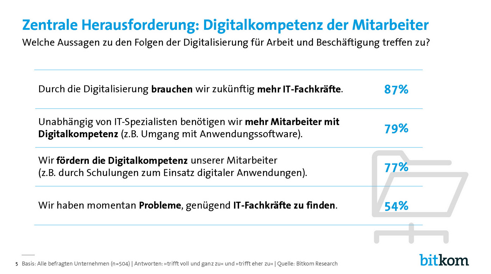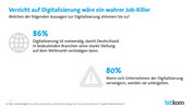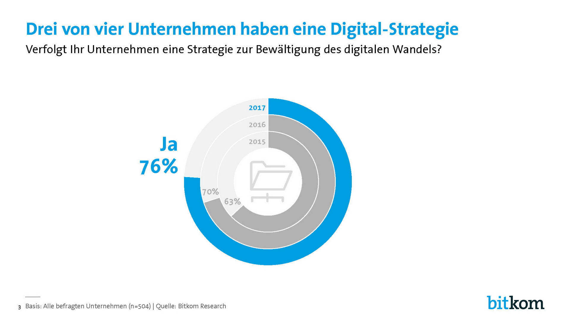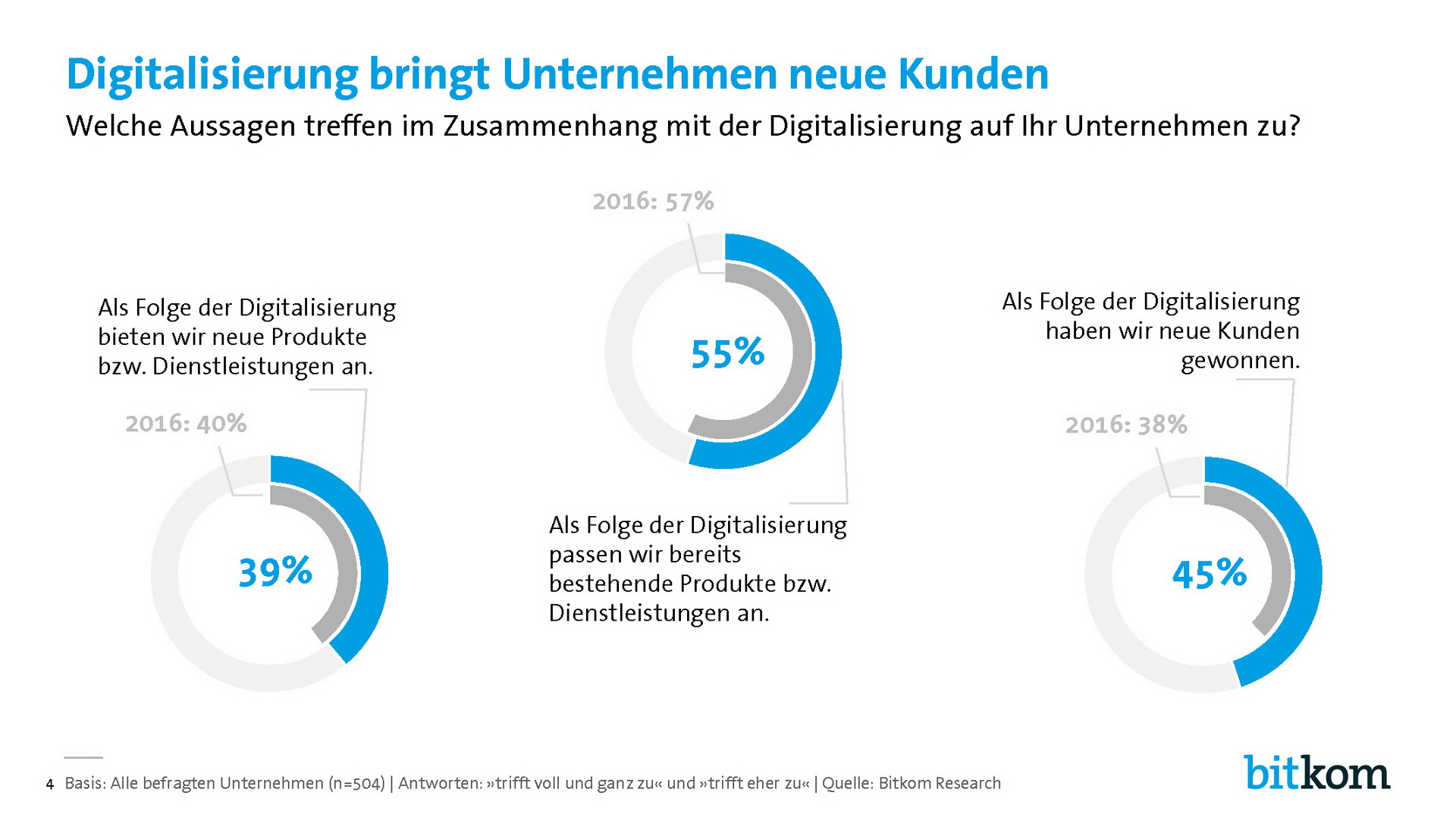 Das ist das Ergebnis einer repräsentativen Umfrage im Auftrag des Digitalverbands Bitkom, die auf der CeBIT 2017 in Hannover vorgestellt wurde. Laut der Befragung ist für 86 Prozent die Digitalisierung notwendig, damit Deutschland in bedeutenden Branchen wie dem Maschinen- oder dem Automobilbau seine starke Stellung auf dem Weltmarkt verteidigen könne. 80 Prozent sind der Meinung, wenn sich Unternehmen der Digitalisierung verweigerten, würden sie sich ins Aus manövrieren.