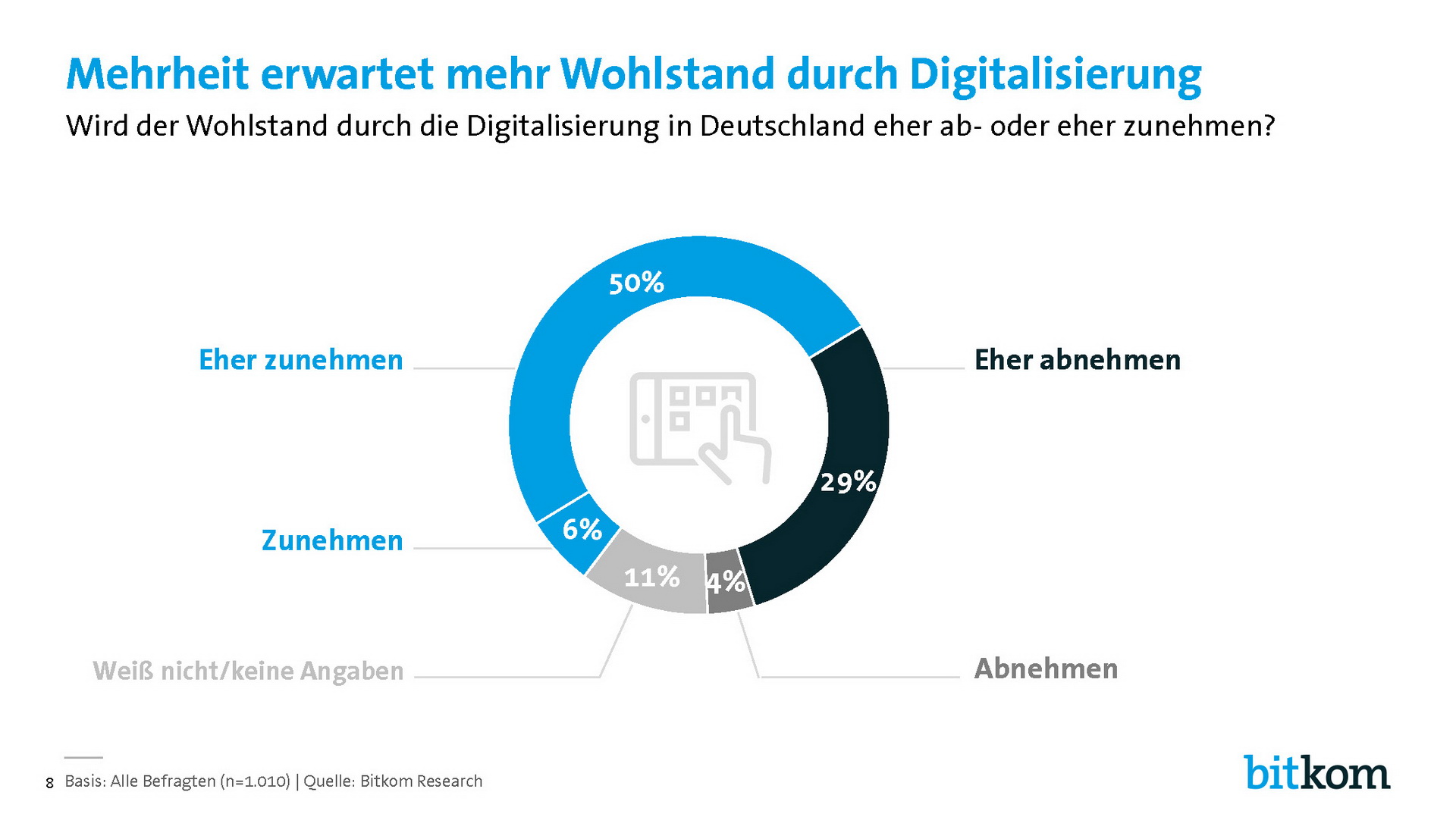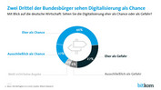 Die Mehrheit der Bürger in Deutschland erwartet, dass der Wohlstand hierzulande durch die Digitalisierung zunehmen wird. Sowohl die Wirtschaft als auch die Verbraucher sehen aktuell deutlich mehr Chancen als Risiken durch die digitale Transformation. 56 Prozent der Deutschen gehen von einem Wachstum aus. Nur 33 Prozent rechnen mit einem abnehmenden Wohlstand. Gleichzeitig sagen mit 63 Prozent fast zwei Drittel der Deutschen ab 14 Jahre, dass die Digitalisierung für die deutsche Wirtschaft eine Chance ist. 33 Prozent sehen sie als Gefahr.