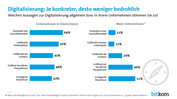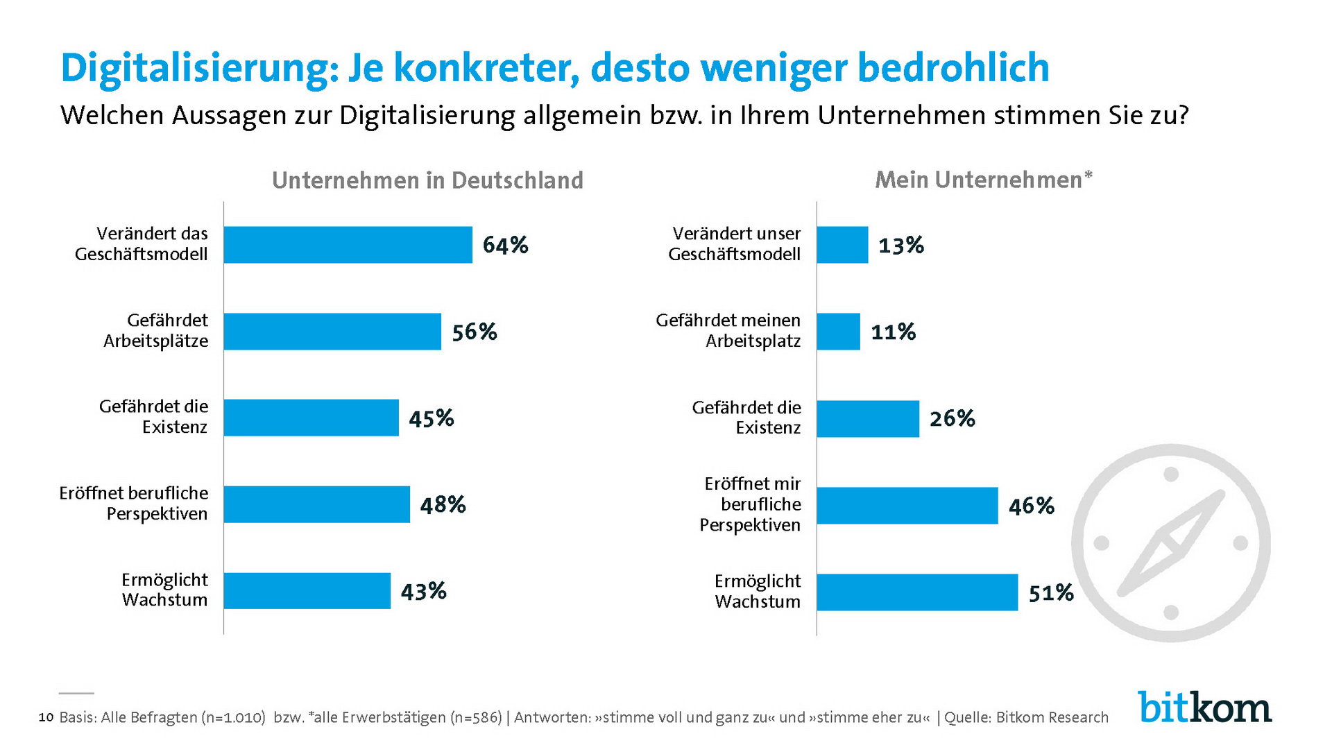 Der Umfrage zufolge werden die Ängste vor den Auswirkungen der Digitalisierung geringer, je konkreter sie für die Befragten zu fassen sind. So geben 56 Prozent der Bundesbürger an, die Digitalisierung gefährde Arbeitsplätze in Deutschland, aber nur 11 Prozent der Erwerbstätigen sehen ihren eigenen Arbeitsplatz bedroht. Und fast jeder zweite Deutsche (45 Prozent) glaubt, dass die Digitalisierung die Existenz von Unternehmen in Deutschland bedroht. Aber: Nur jeder vierte Erwerbstätige (26 Prozent) sorgt sich in dieser Hinsicht um seinen eigenen Arbeitgeber.