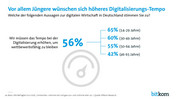 Gleichzeitig sagt fast jeder zweite Erwerbstätige, dass ihm die Digitalisierung berufliche Perspektiven eröffnet (46 Prozent) und Wachstum für das Unternehmen ermöglicht, in dem er arbeitet (51 Prozent). Eine Mehrheit der Bundesbürger (56 Prozent) wünscht sich daher, das Tempo der Digitalisierung in Deutschland zu erhöhen, um die Wettbewerbsfähigkeit der Wirtschaft zu erhalten. Unter den 14- bis 29-Jährigen sagen das sogar zwei Drittel (65 Prozent).