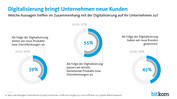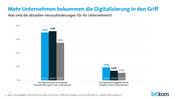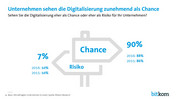 Aber nicht nur die Bürger, auch die Unternehmen sehen die Digitalisierung positiv. 9 von 10 Geschäftsführern und Vorständen (90 Prozent) in Unternehmen ab 20 Mitarbeitern sagen, dass die Digitalisierung für das eigene Unternehmen eher Chancen biete, nur 7 Prozent sehen sie vor allem als Risiko. Damit hat sich die digitalisierungsfreundliche Stimmung verglichen mit dem Vorjahr noch einmal leicht gesteigert (88 bzw. 10 Prozent).