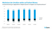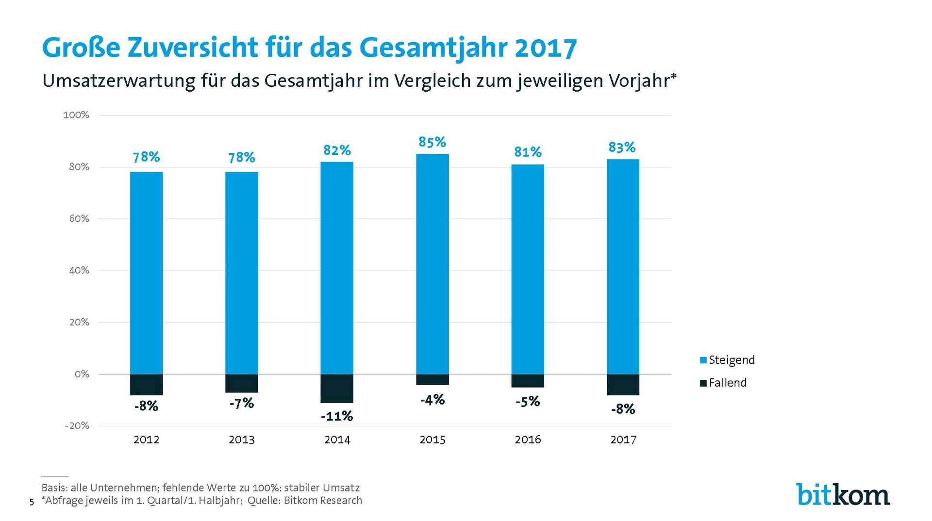 85 Prozent der Unternehmen im Bereich Software und 83 Prozent der IT-Services-Firmen gehen von wachsenden Umsätzen aus. 65 Prozent der Hersteller von IT-Hardware erwarten ein Umsatzplus, Produzenten von Kommunikationstechnik gehen zu 62 Prozent von höheren Umsätzen aus. Für das Gesamtjahr 2017 ist die Zuversicht in der IT- und Telekommunikationsbranche groß.