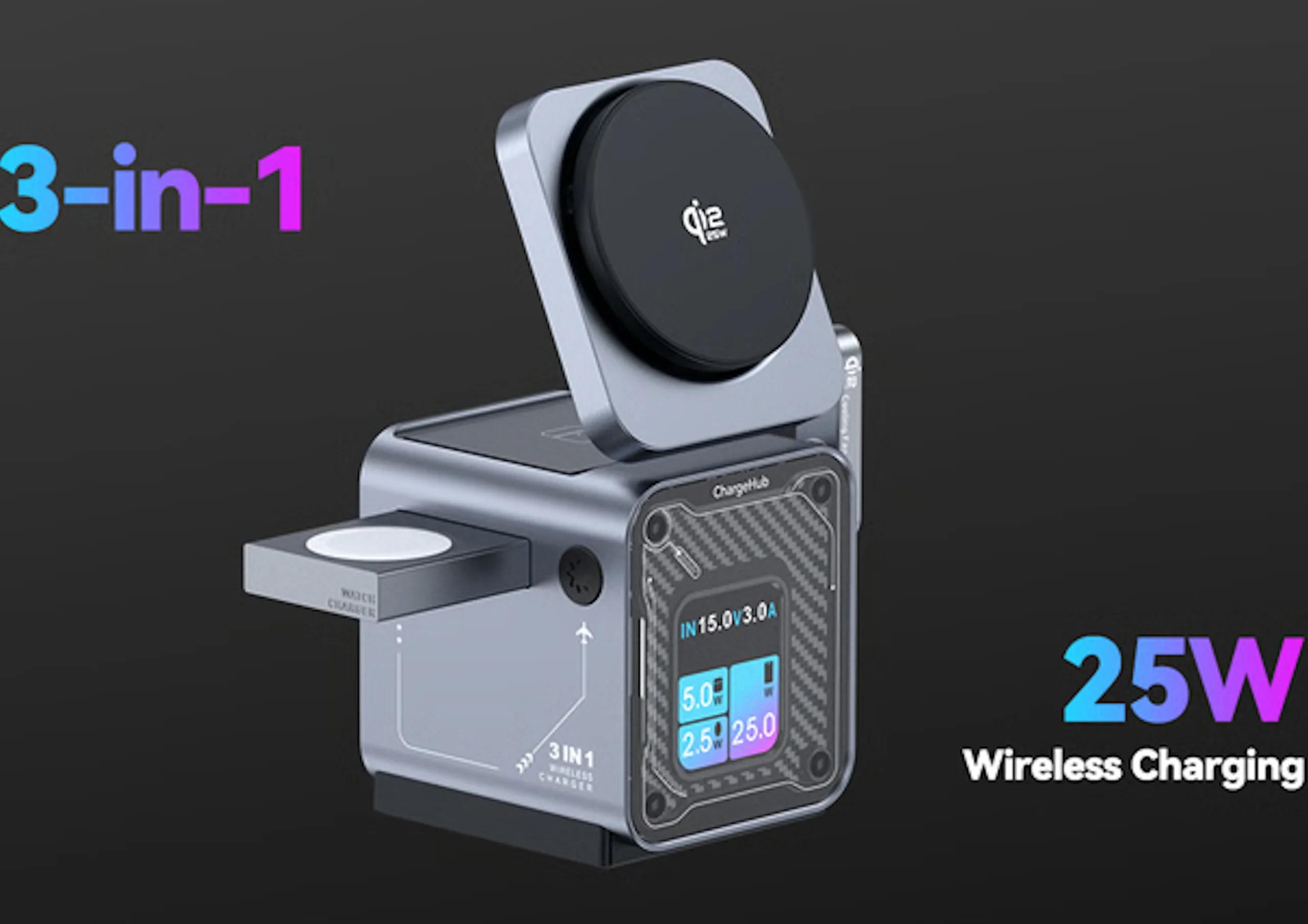 Verbaut ist ein Display. Dieses kann wie üblich die Ladeleistung anzeigen, allerdings ist es auch möglich, eine Uhr anzuzeigen. Dabei handelt es sich um einen Touchscreen. Die Lademöglichkeit für die Smartwatch lässt sich einfahren, das Ladepad für das Smartphone auch anwinkeln, womit das Smartphone ablesbar bleibt. Das System selbst wird über USB Typ C mit optimalerweise 45 Watt versorgt.