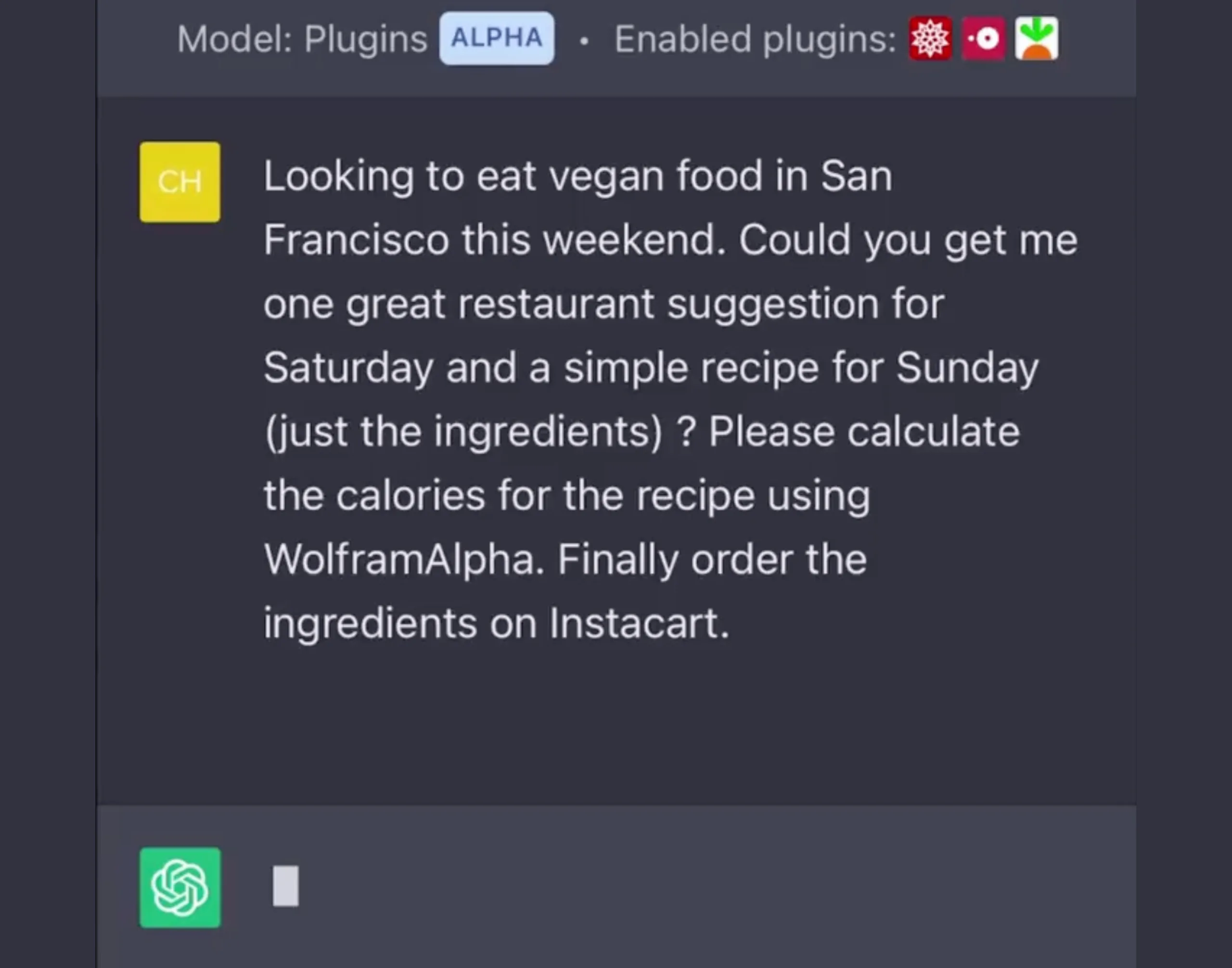 Die neuen Plugins können jedoch nicht nur Informationen aus dem Web in Echtzeit abrufen, sondern sich auch mit APIs verbinden und Aktionen im Namen des Benutzers ausführen. So kann die Suchmaschine Bing zwar Informationen über verschiedene Restaurants, Flüge oder Hotels liefern, ChatGPT kann jedoch auch Buchungen und Bestellungen vornehmen. In folgendem Twitter-Video kann man sehen, wie ein Nutzer mit Hilfe von ChatGPT ein Rezept zusammenstellt und die KI anschließend selbstständig die benötigten Zutaten beim Lieferservice bestellt: