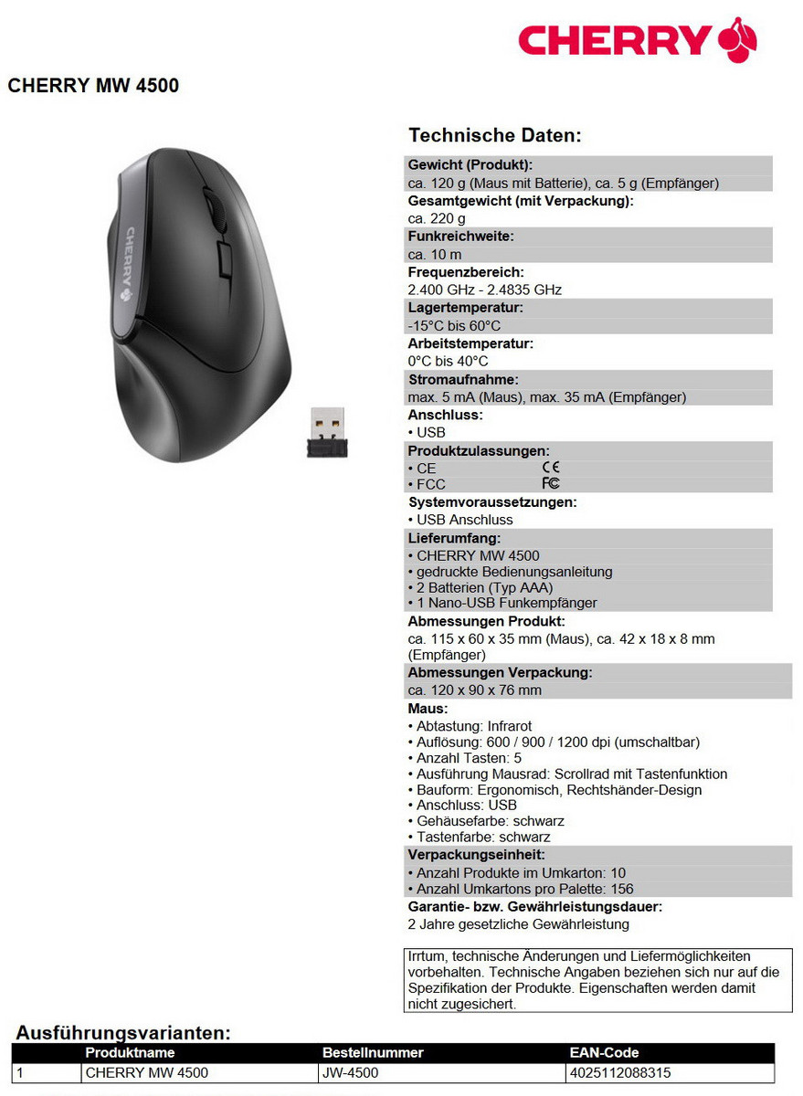 Als Sensor dient der Cherry MW 4500 ein Infrarot-Sensor mit maximal 1.200 DPI. Mittels einer Taste lässt sich die Auflösung in drei Stufen (600, 900 und 1.200 dpi) einstellen. Neben den zwei Haupttasten stehen vier weitere Tasten für Eingaben sowie ein Scrollrad bereit.