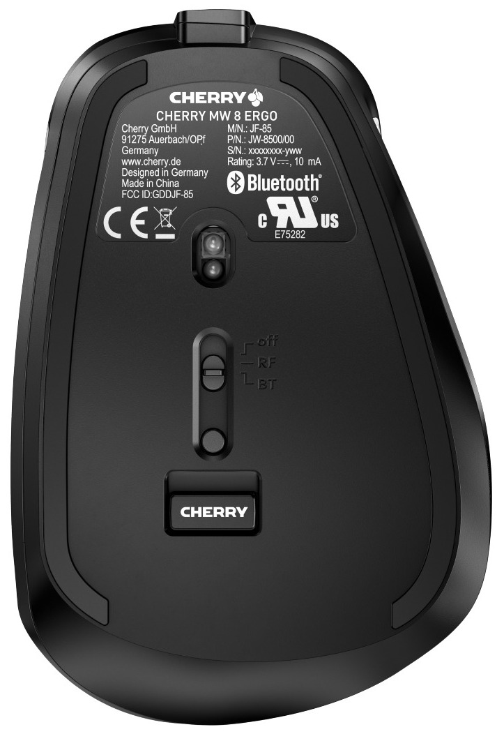 Die Cherry MW 8 Ergo lässt sich entweder direkt über die integrierte Bluetooth-4.0-Schnittstelle mit dem Rechner verbinden oder alternativ über den mitgelieferten USB-Empfänger und eine 2,4-GHz-Funkverbindung. Via Schieberegler an der Unterseite der MW 8 Ergo-Maus kann zwischen den beiden Verbindungs-Modi gewechselt werden. Dadurch ist es möglich, die MW 8 Ergo mit einem Notebook sowie einem Desktop-PC parallel zu koppeln.