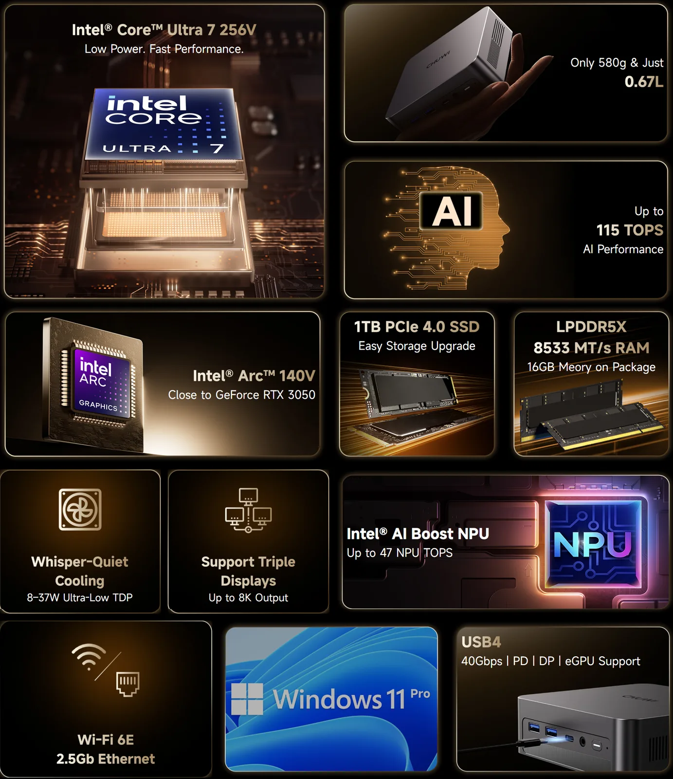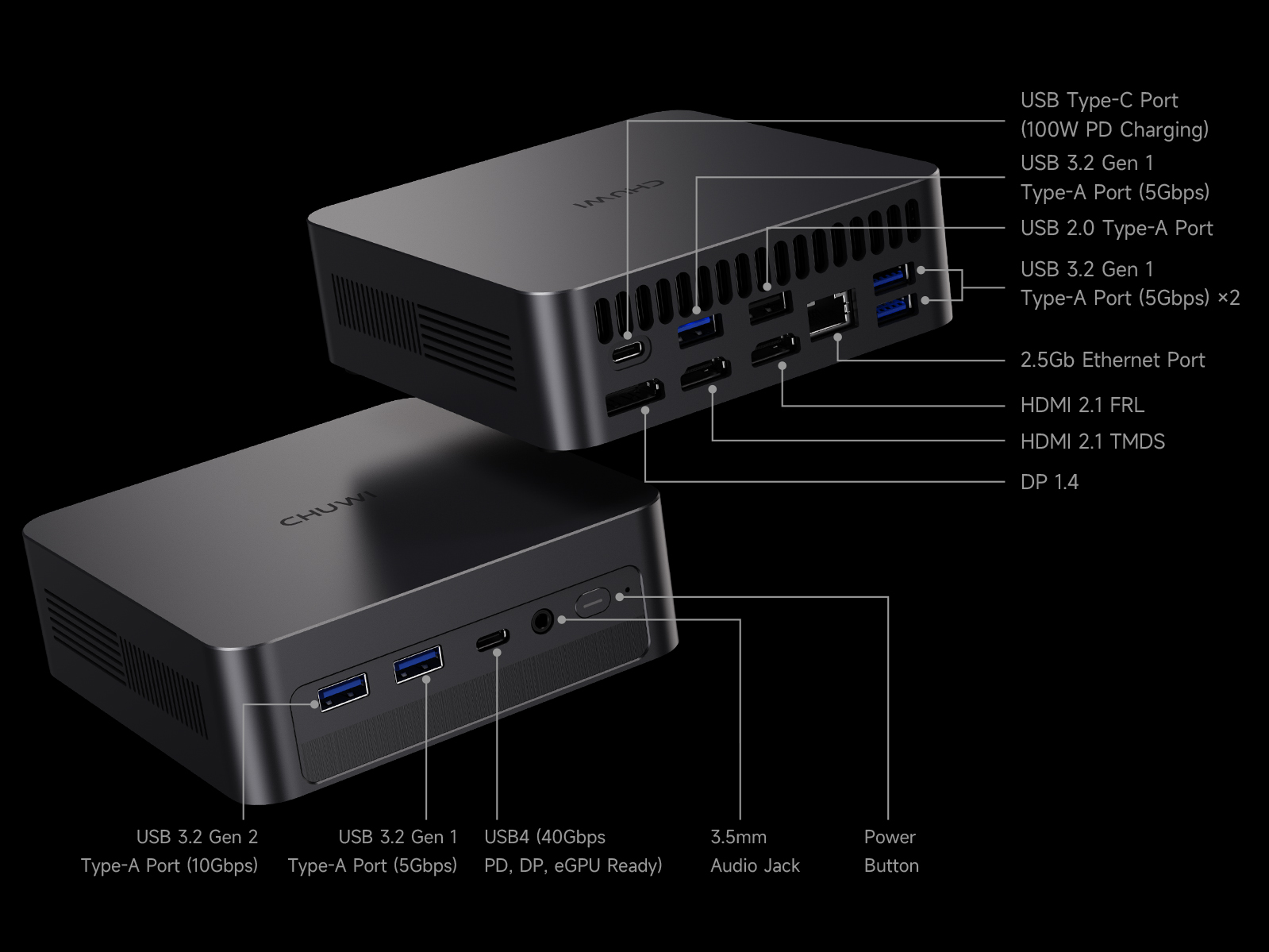 Für drahtlose Verbindungen sind WiFi 6E und Bluetooth 5.4 mit an Bord. Chuwi hebt außerdem hervor, dass der Mini-PC ein 0,67-Liter-Gehäuse besitzt. Diese kompakte Bauform macht ihn besonders für kleine Arbeitsplätze interessant. Das System ist mit 16GB LPDDR5X-RAM und 1TB PCIe-4.0-Speicher ausgestattet, es gibt aber zwei M.2-Steckplätze, von denen einer PCIe-5.0-SSDs unterstützt.