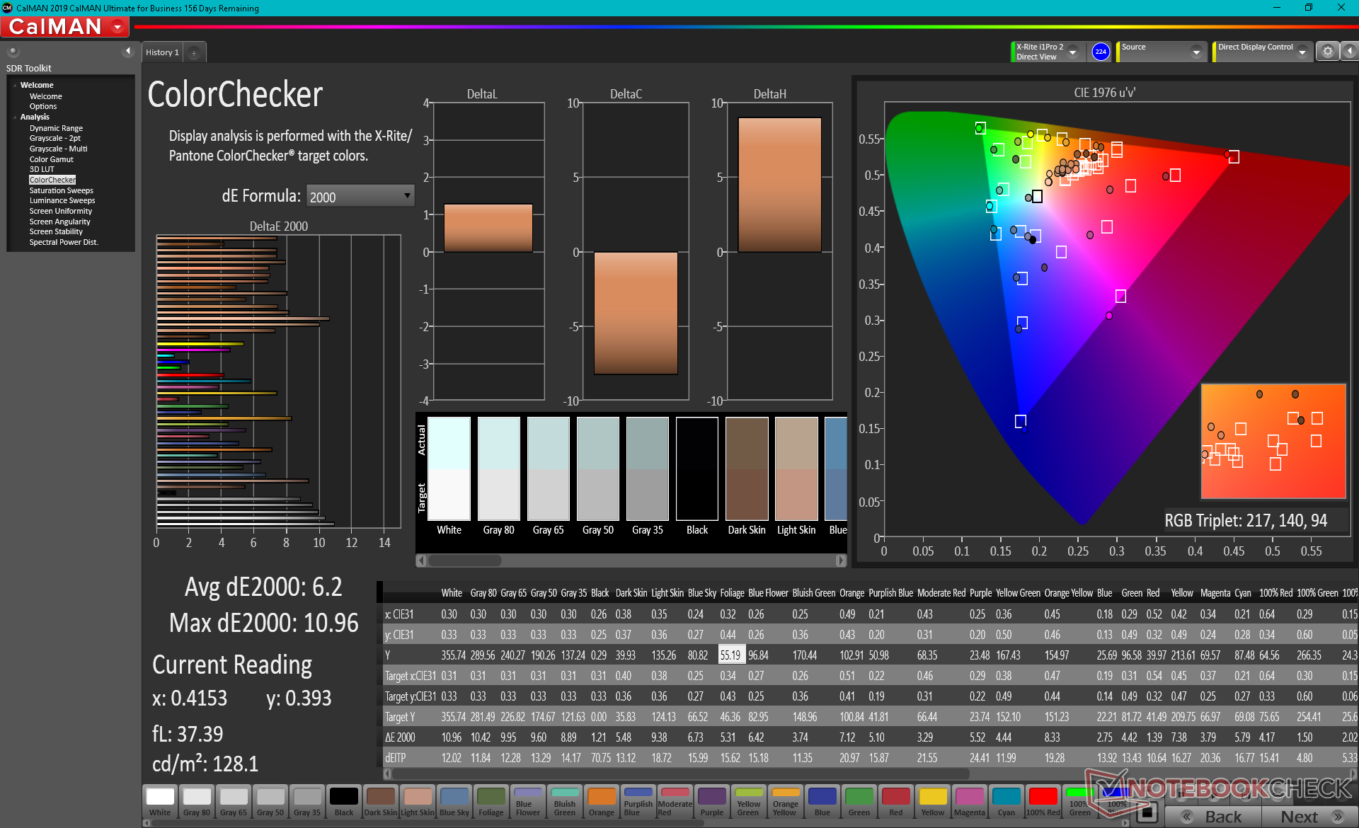 X-Rite-Colorimeter-Messungen zeigen ein sehr schlecht kalibriertes Display ab Werk trotz der oben erwähnten beeindruckenden Farbabdeckung. Kurz gesagt, der Hersteller hat hochwertige Panels von Chi Mei bezogen, aber er hat nicht die Ressourcen, jedes einzelne im Werk zu kalibrieren. Wir empfehlen dringend, das Panel zu kalibrieren oder unser oben genanntes ICC-Profil anzuwenden, um das Beste aus dem Display herauszuholen. Graustufen- und Farb-DeltaE-Werte würden sich deutlich verbessern, wie unsere CalMAN-Ergebnisse unten zeigen.