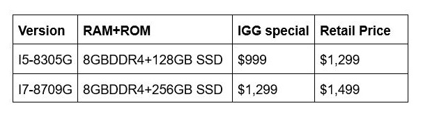 Beide bieten also eine Kaby-Lake-G-CPU mit Huckepack-GPU der Radeon RX Vega M-Familie und 8 GB RAM an Bord. Zur Auswahl stehen der Core i5-8305G sowie der Core i7-8709G, ersterer mit 128 GB SSD, letzterer mit 256 GB SSD. Die Indiegogo-Preise sind natürlich wieder niedriger als die geplanten offiziellen Listenpreise, wer vorab sein Interesse bekundet, wird zudem über den Start der Kampagne und Super Early Bird-Angebote informiert, die auf die ersten 200 Unterstützer limitiert sind.