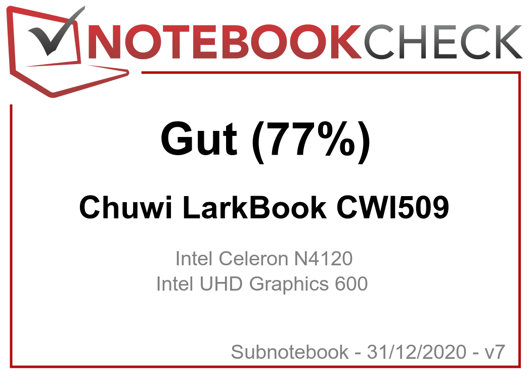 | 76.9 % v7 (old) | 01 / 2021 | Chuwi LarkBook CWI509 Celeron N4120, UHD Graphics 600 | 1.1 kg | 12.3 mm | 13.30" | 1920x1080 | |