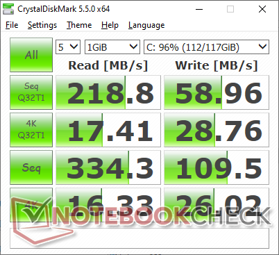 Der primäre 128-GB-eMMC ist in seiner Leistung Smartphones ähnlicher als anderen klassischen Mini-PCs oder Subnotebooks. Die maximale sequentielle Schreibgeschwindigkeit von nur etwa 106 MB/s ist langsam, aber im Hinblick auf die erwartete Arbeitsbelastung ausreichend. Kapazität ist in diesem Fall im Allgemeinen wichtiger als Übertragungsraten. Nutzer können den Speicher über M.2 2242 oder MicroSD erweitern.