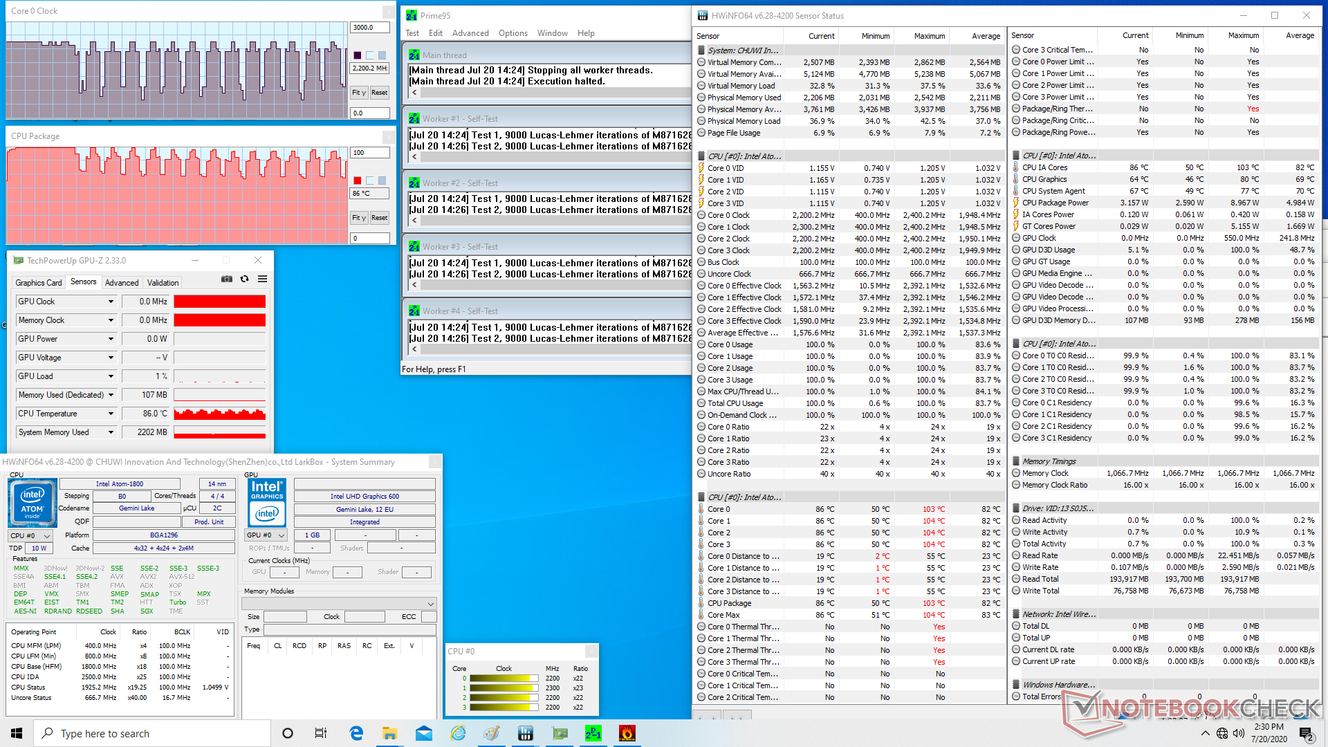 Beim Ausführen von Prime95 steigen die Taktraten auf 2,4 GHz und bleiben etwa eine Minute lang bei 100 °C, bevor sie, wie unsere Screenshots unten zeigen, zwischen 900 MHz bei 68 °C und 2.4 GHz bei 98°C hin- und herschwanken. Interessanterweise werden Taktraten und Temperatur stabiler, wenn Prime95 und FurMark gleichzeitig laufen.