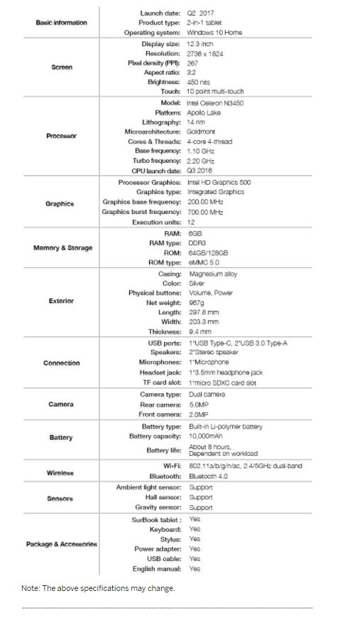 Beim SurBook handelt es sich um ein Tablet mit dem vom Surface Pro (4) bekannten 12,3 Zoll IPS-Display mit 2.736 x 1.824 Pixeln Auflösung im 3:2 Format. Auch wenn der Gerätevergleich auf der Indiegogo-Seite von Chuwi natürlich eindeutig zu Gunsten des eigenen Produkts ausfällt, sollte man bedenken, dass man um den Preis natürlich nur ein Gerät mit Apollo Lake Atom-Prozessor erhält und nicht eines mit deutlich schnellerer Core-CPU. Das SurBook ist mit hochauflösendem Display, Stiftunterstützung und Windows 10 Home aber gut für nicht allzu rechenintensive Standardaufgaben geeignet, die Auslieferung ist für Juli geplant, kann sich aber natürlich noch verzögern, da die Massenproduktion erst im Juni beginnt.