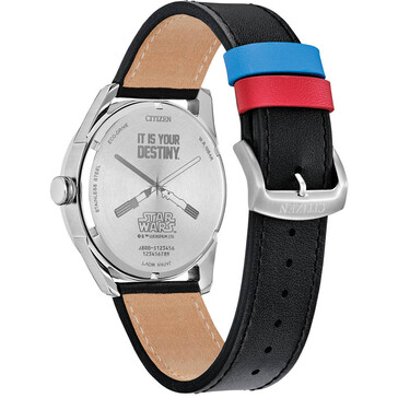 Das Zifferblatt zeigt eine Grafik des bekannten Duells zwischen Luke Skywalker und Darth Vader auf Cloud City aus Das Imperium schlägt zurück. Auf der Position bei 6 Uhr ist eine Silhouette von Skywalker zu sehen, während Vaders Helm am oberen Rand des Zifferblatts platziert ist. Die Uhr nutzt rote und blaue Zeiger als Anspielung auf die Lichtschwerter der beiden Figuren, ergänzt durch farblich passende Schlaufen am schwarzen Lederarmband.