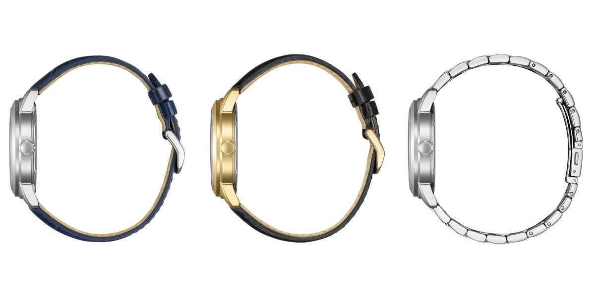 Die Citizen AW0151-00LC kommt in Blau und Silber mit einem dunkelblauen, strukturierten Zifferblatt und passendem Lederarmband. Das Gehäuse sowie die Armband-Schließe bestehen aus silberfarbenem Edelstahl. Die AW0153-04AC ist ebenfalls mit Lederarmband ausgestattet, diesmal in Schwarz, und besitzt ein weiß-cremefarbenes Zifferblatt sowie ein goldfarbenes Edelstahlgehäuse. Die beiden Edelstahlmodelle AW0151-85EC und AW0151-85XC verfügen jeweils über ein silberfarbenes Gehäuse und Armband; während das Zifferblatt der AW0151-85EC schwarz strukturiert ist, präsentiert die AW0151-85XC ein grünes, gleichfalls strukturiertes Zifferblatt.