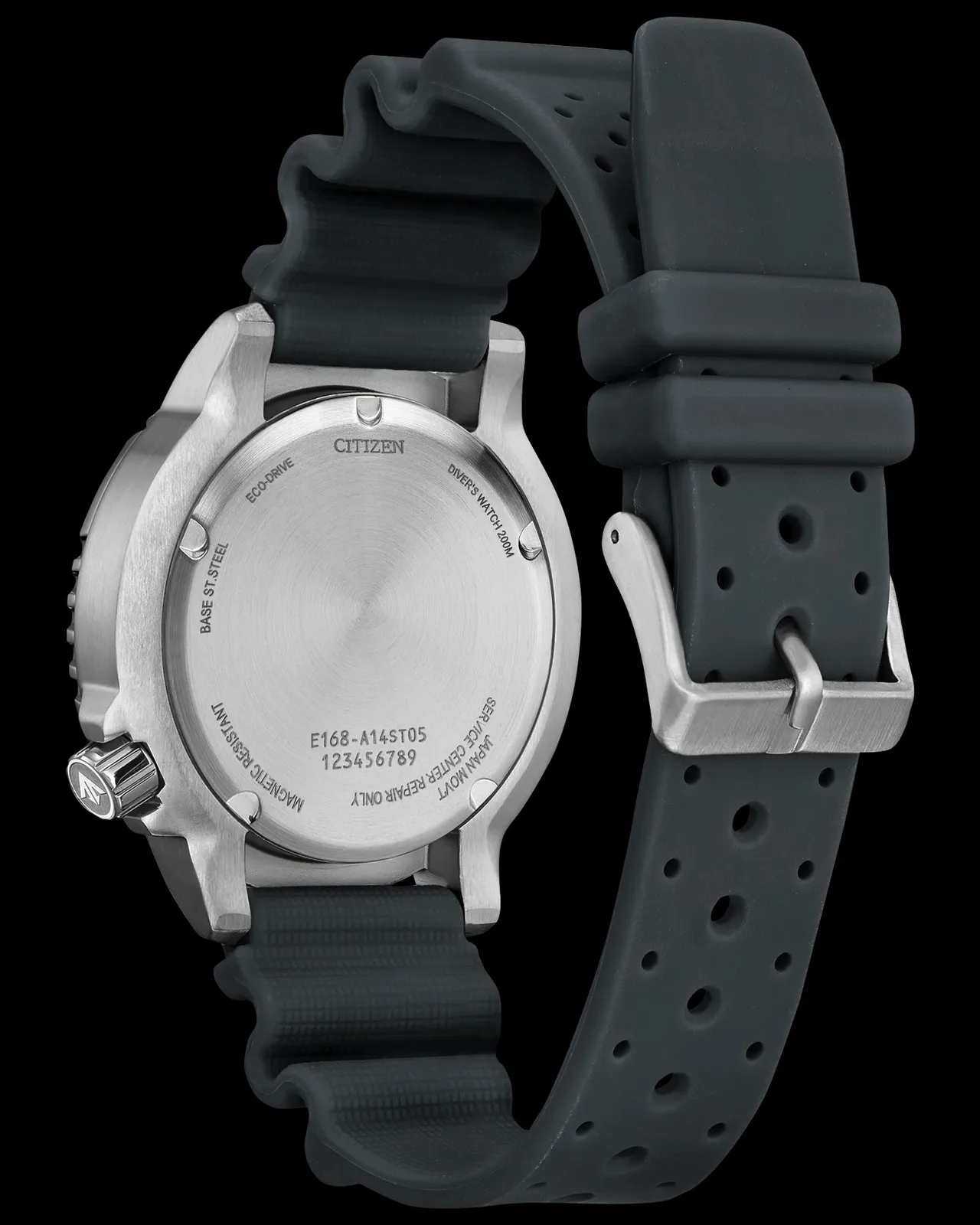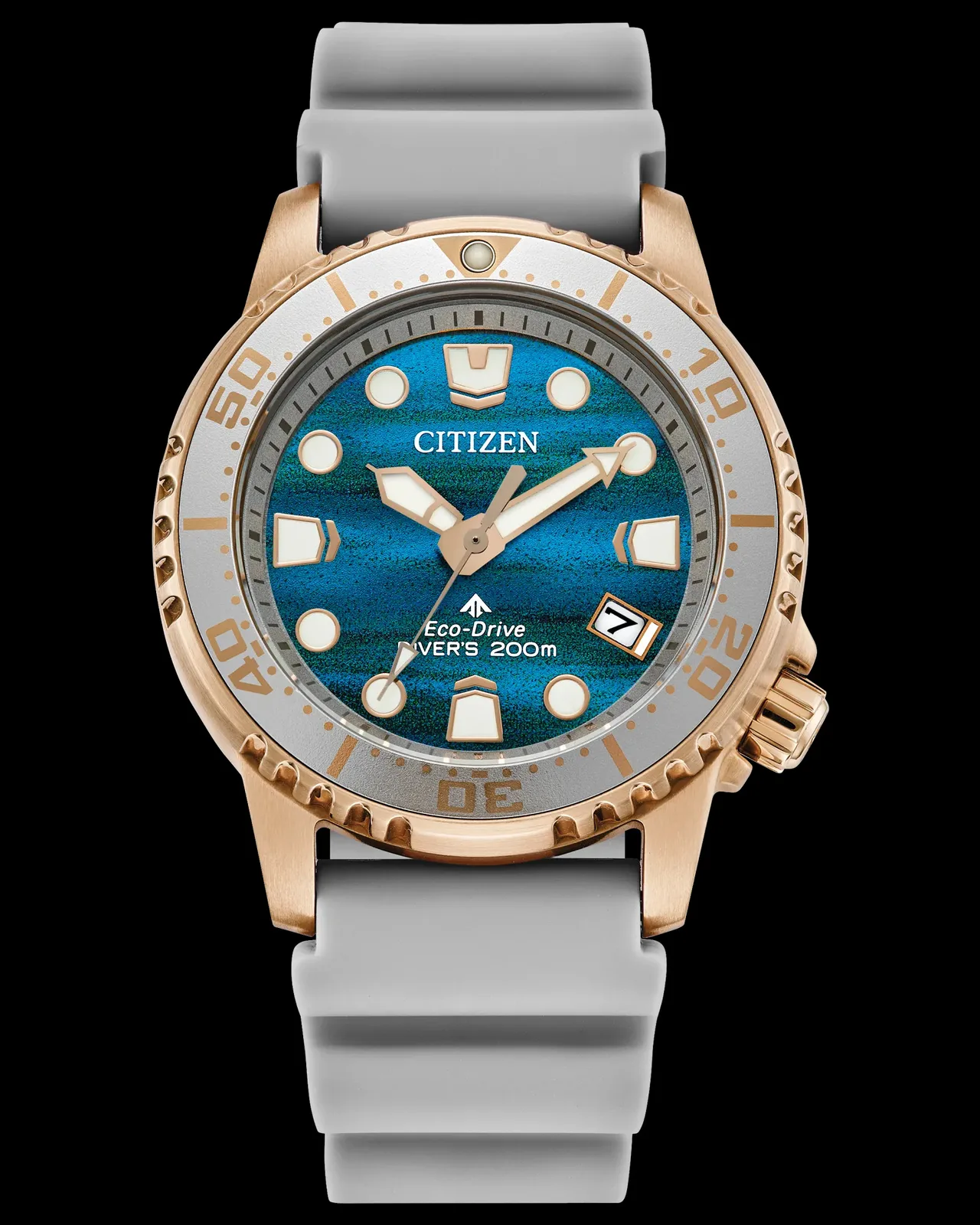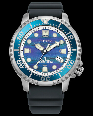 Das farbenfrohe Zifferblatt beschreibt Citizen als „Structural Ink“-Finish mit horizontalen Streifen. Dieses erzeugt eine schimmernde blaue Oberfläche, die je nach Lichteinfall leicht ins Violette übergeht. Der Effekt kommt bei beiden Varianten zum Einsatz, während sich das übrige Design an den bekannten Promaster-Taucheruhren orientiert.