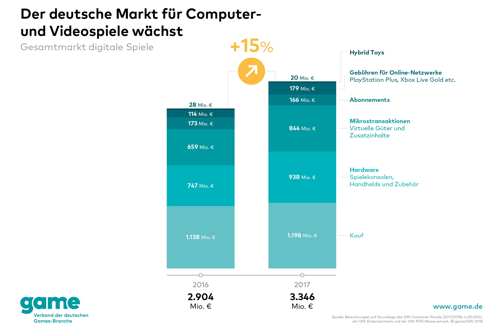 Deutschland - Land der Spieler und Zocker? Wie der "game" als Verband der deutschen Games-Branche auf Basis von Daten der Marktforschungsunternehmen GfK und GfK Entertainment bekannt gab, ist der Markt für Computer-Games und Videospiele sowie Gaming-Hardware in Deutschland im vergangenen Jahr 2017 deutlich gewachsen. Im Vergleich zu 2016 wuchs der Gesamtmarkt um 15 Prozent auf über 3,3 Milliarden Euro. Damit durchbrach der deutsche Games-Markt erstmals die 3-Milliarden-Euro-Marke.