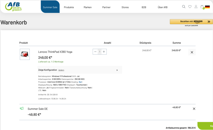 Im Summer Sale des AfB-Shops gibts gerade das Lenovo ThinkPad X380 Yoga Business-Convertible inklusive Eingabestift und Windows 11 Pro für günstige 199 Euro. Um auf den Deal-Preis zu kommen gibt man den Gutscheincode "SUN20" im Warenkorb an.