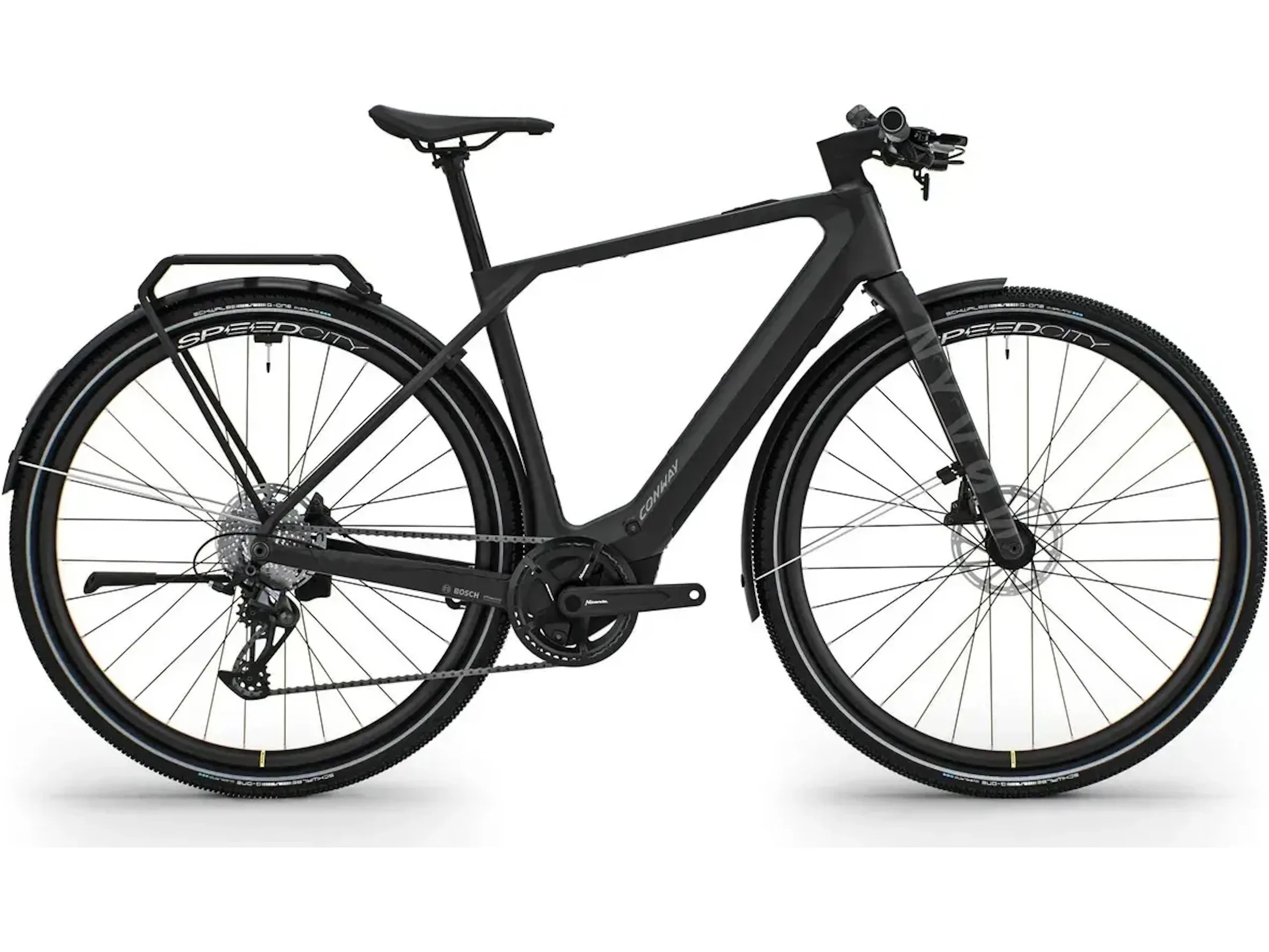 Das Conway Nyvon 8.0 C ist ein bereits erhältliches Gravel-Bike mit Elektromotor, wobei dieses mit einer mehr oder weniger für ein Trekking-E-Bike typischen Ausstattung kommt, allerdings gibt es eine Aufnahme: So nutzt Conway keine Federgabel, stattdessen wird eine aus Carbon gefertigte Starrgabel eingesetzt. Nicht nur die Gabel, sondern mehr oder weniger der gesamte Rahmen besteht aus diesem leichtem, aber dennoch stabilen Material. Wie üblich lässt sich so eine doch erhebliche Gewichtsreduktion erzielen, konkret bringt das Conway Nyvon 8.0 C 16,9 Kilogramm auf die Waage, was natürlich auch vor dem Hintergrund der umfangreichen Ausstattung zu betrachten ist. So ist nicht nur eine Beleuchtung verbaut, stattdessen zählen auch Schutzbleche und eine ein Fahrradständer zum Lieferumfang. Ein Gepäckträger der eher modernen Bauart ist vorhanden, damit dürfte sich das Fahrrad auch für Fahrradtouren eignen - und zwar dann nicht nur über perfekt ausgebaute Radwege und Straßen.