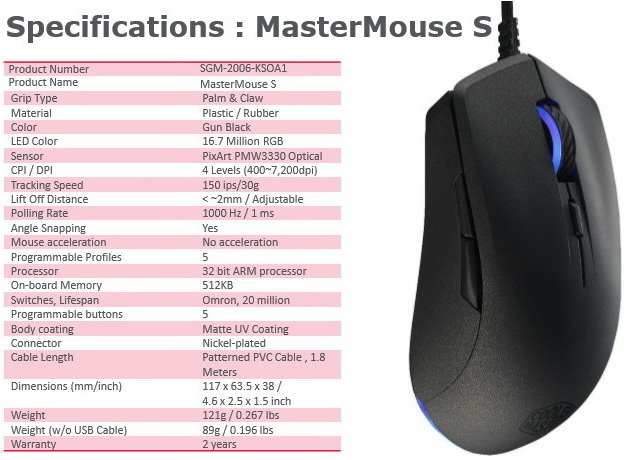 Im Gegensatz zur Lite S kommt die MasterMouse S mit einer RGB-Beleuchtung mit 16,7 Millionen Farben daher, die sich via Software individuell anpassen lässt. Für Macros und benutzerspezifische Settings nutzt die CoolerMaser-Maus 512-KB-Onboard-Memory. Bei der MasterMouse S kommt zudem ein optischer PixArt PMW3330 Sensor und Omron-Switches mit einer avisierten Lebensdauer von bis zu 20 Millionen Auslösungen zum Einsatz.