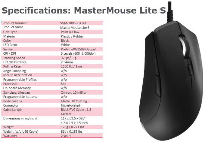 Die günstigste Gaming-Maus der Serie bietet als MasterMouse Lite S eine weiße Beleuchtung und einen optischen PixArt PAW3509 Sensor, mit dem sich drei DPI-Stufen (600, 1.000 und 2.000) einstellen lassen. Die inklusive 1,8 Meter langem USB-Kabel (PVC) 123 Gramm schwere Lite S präsentiert sich ansonsten in einem mattschwarzem Finish mit zwei Hauptschaltern unter den Maustasten, die laut CoolerMaster bis zu 10 Millionen Klicks überstehen.