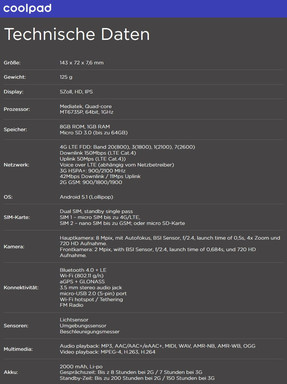 Angetrieben wird das 7,6 Millimeter flache und 125 Gramm schwere Coolpad Porto S von einem MediaTek MT6735P 4-Kern-Prozessor, der mit 1 GHz getaktet ist. Als Speicher verfügt das Smartphone über 1 GB RAM und 8 GB Gerätespeicher. Wer mehr Speicherplatz für Bilder, Videos und Spiele benötigt, der kann eine microSD-Karte in den zweiten SIM-Karten-Einschub stecken und den Speicher um bis zu 64 GB erweitern. Falls kein Zusatzspeicher benötigt wird, lässt sich dort eine zweite SIM-Karte für Reisen ins Ausland oder eine zweite Nummer nutzen.